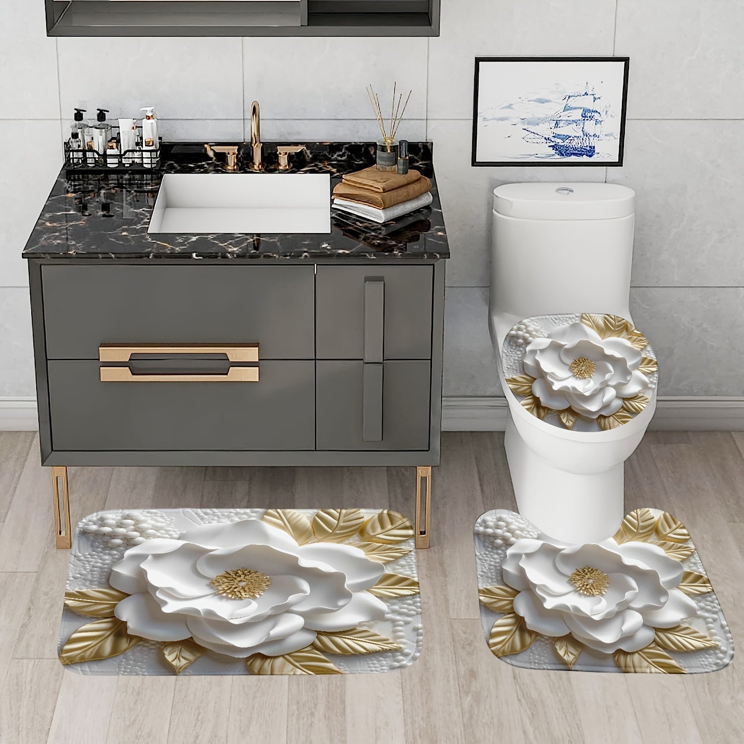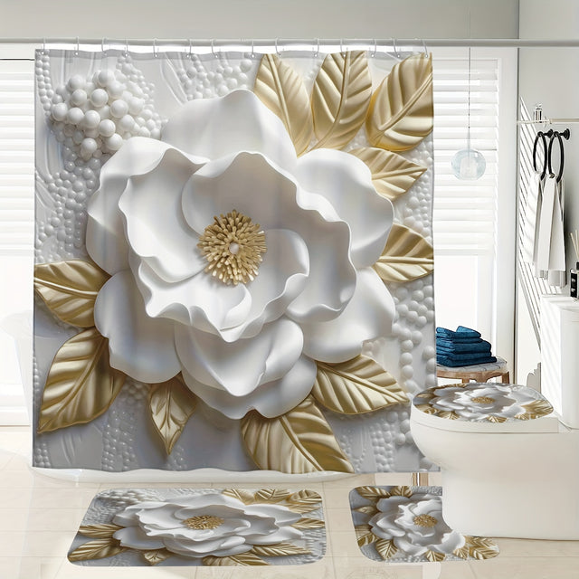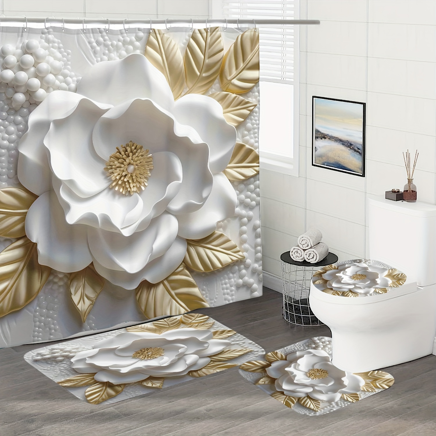 1/4pcs Luxurious 3D Floral Pattern Shower Curtain Set - Waterproof, Non-Slip, Easy-to-Clean Bathroom Essentials with 12 Hooks, U-Shape Toilet Mat, Toilet Lid Cover Pad - Complete Bathroom Decor Solution for a Relaxing Oasis