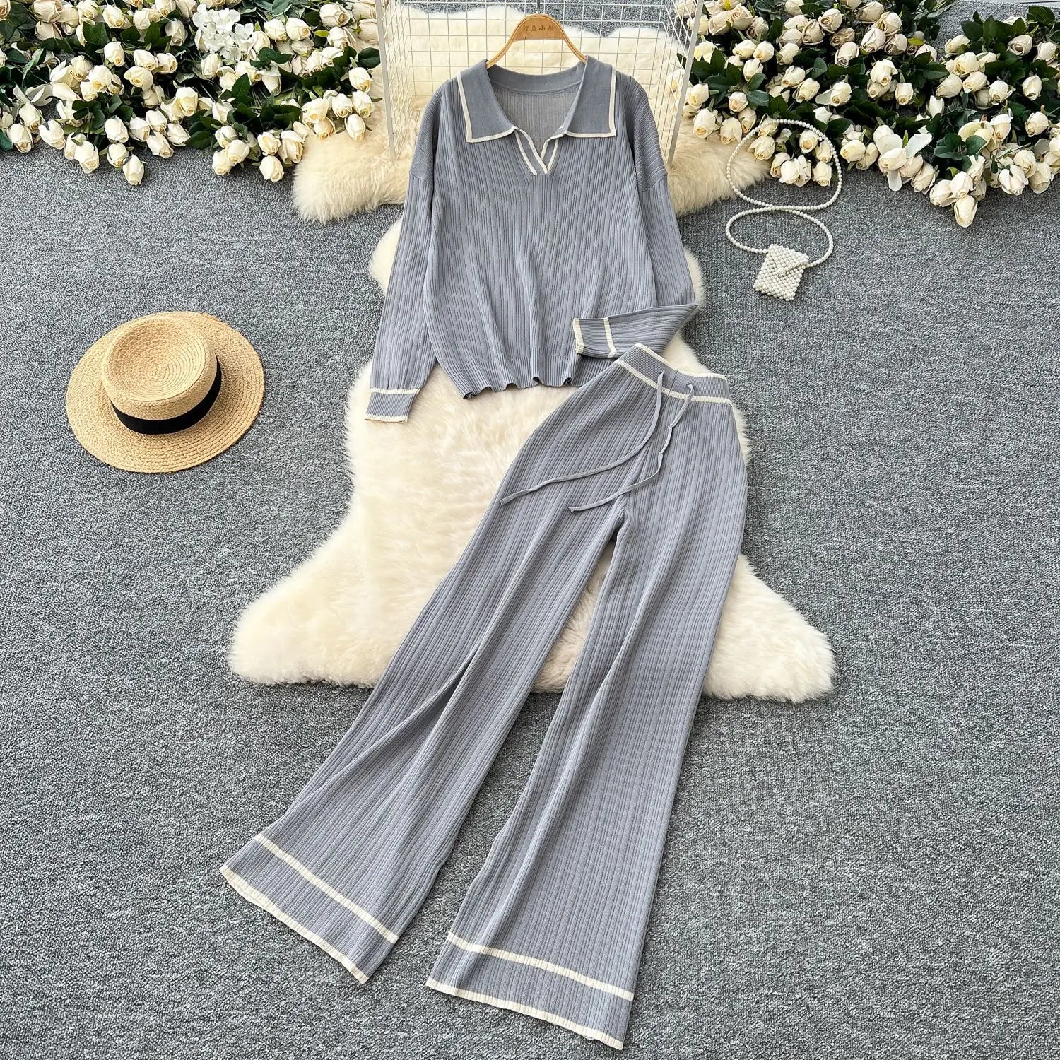 Pant Set Women Two Piece Sets Full Sleeve Turn Down Collar Tops Wide Leg Long Pants Y2k Streetwear Work High Waist Autumn Winter