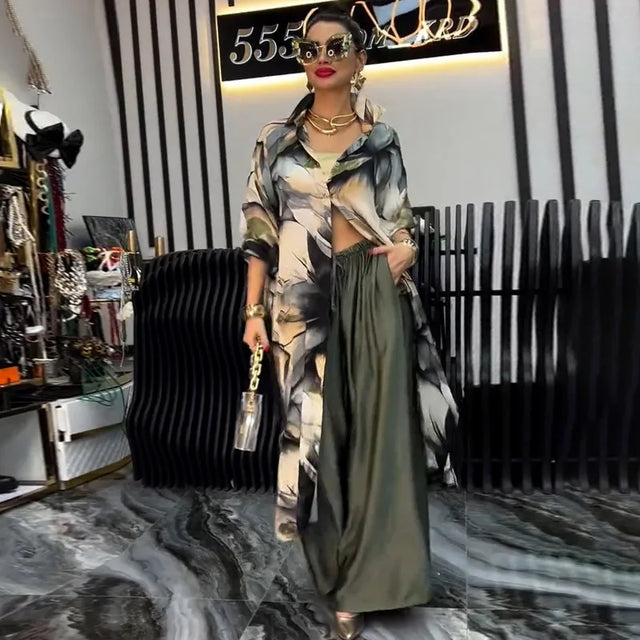 Women Pant Sets Print Shirts Two Piece Single Breasted Long Cardigan Fulls Sleeve Spliced Elegant High Waist Pants Office Lady