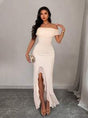 Elenzga Women's Spring/Summer Elegant Off Shoulder Mesh Pleated Ruffle Trim Slit Dress, Suitable For Casual Daily Life, Party, Luxury Ladies Evening Gown
