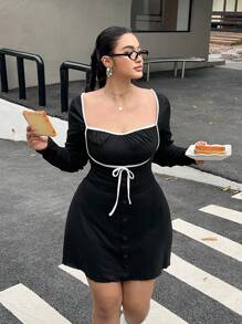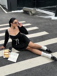Flirla Romantic Contrast Color White Trim Bow Button Decor Long Sleeve Mini Dress