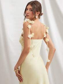 L'Amorae Women's Satin Midi Dress With Flower Patch Detail On Strap Twist Front