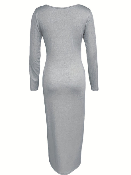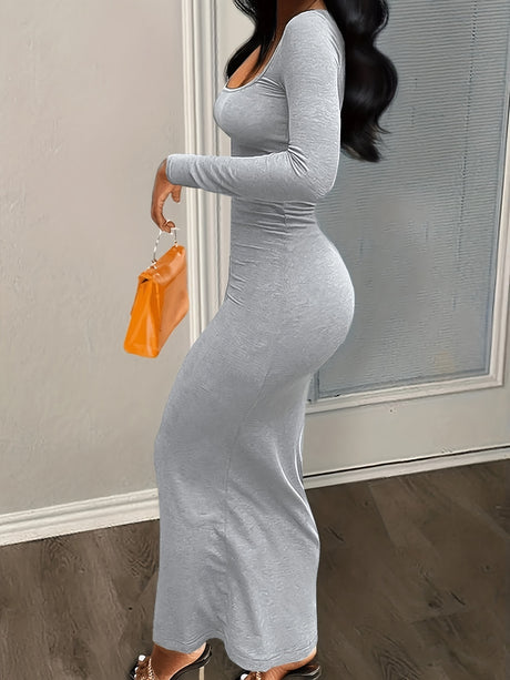 Long Sleeve Solid Casual Maxi Dress, Simple Scoop Neck Dress for Women