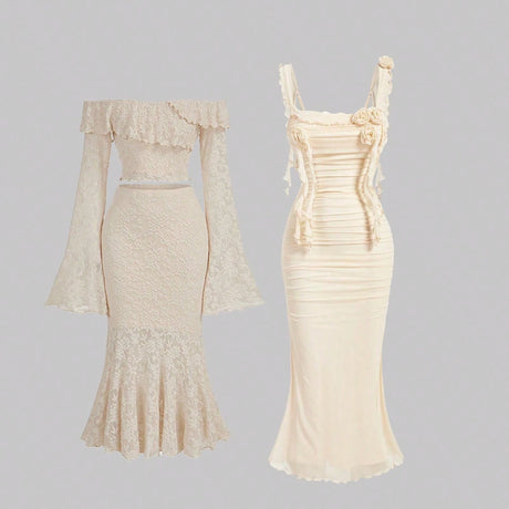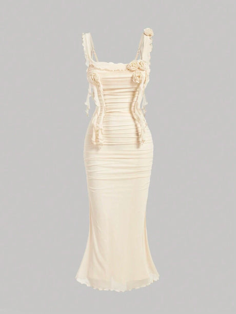 Beige Bodycon Knitted Mesh Dress With 3D Flower Decoration And Dangling Straps