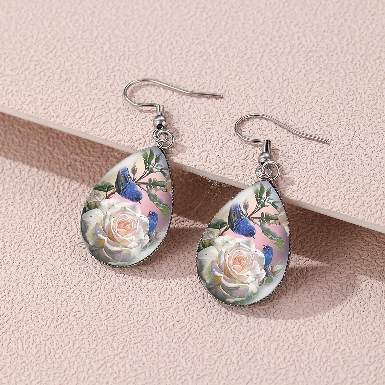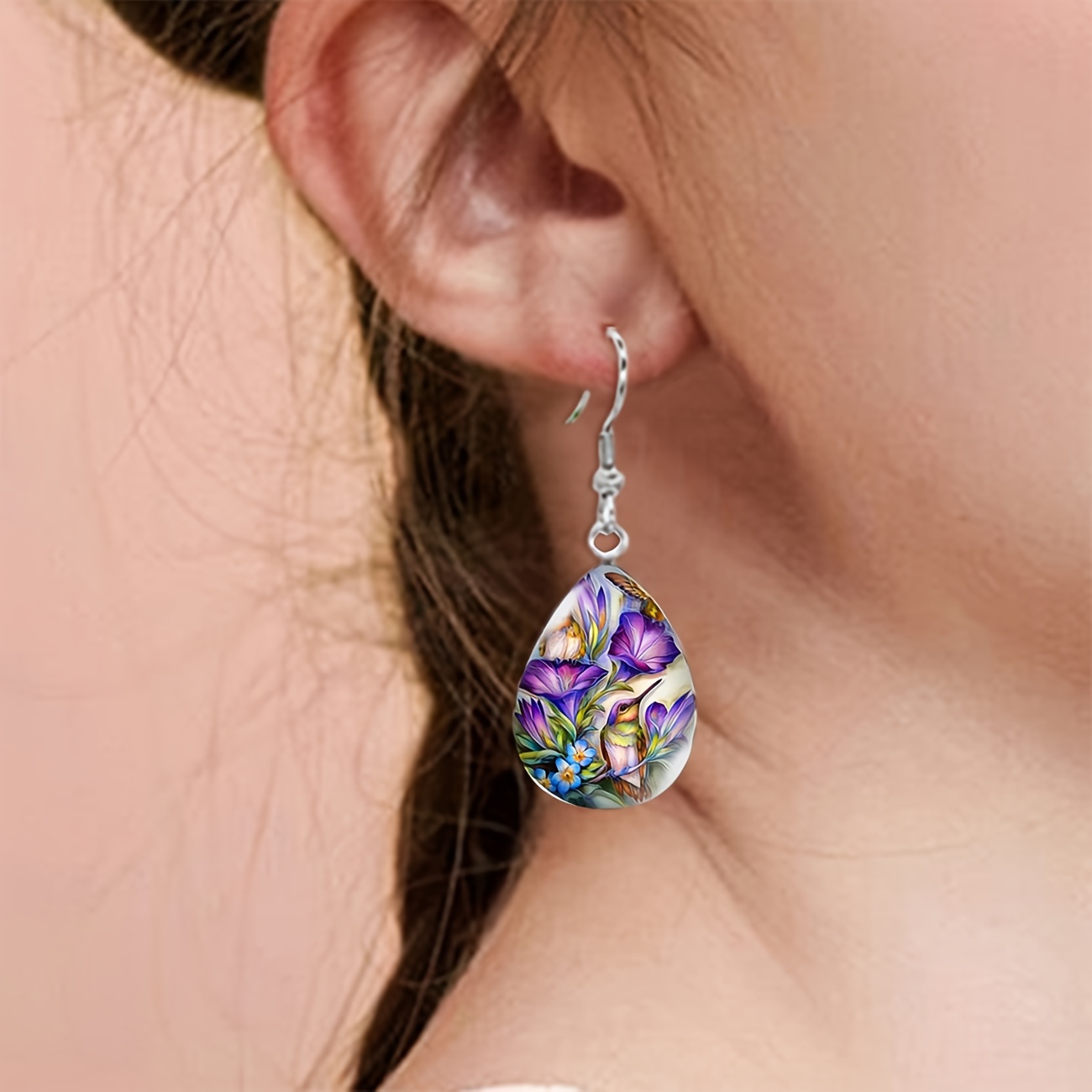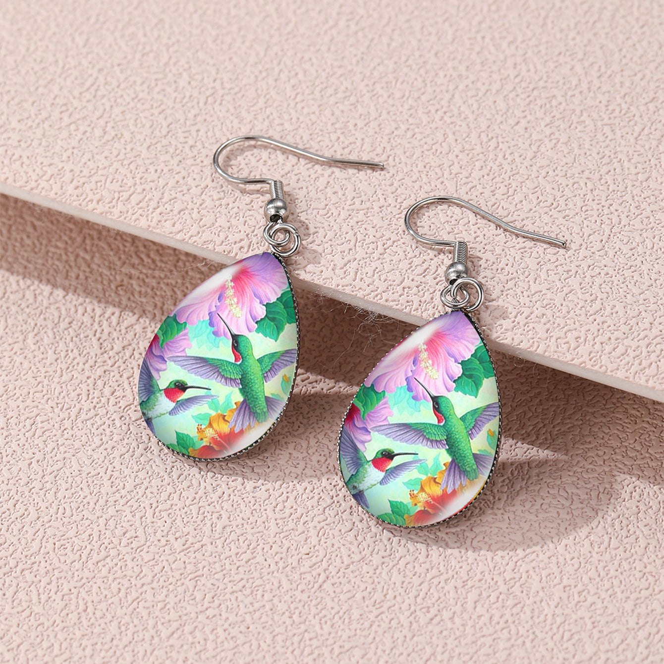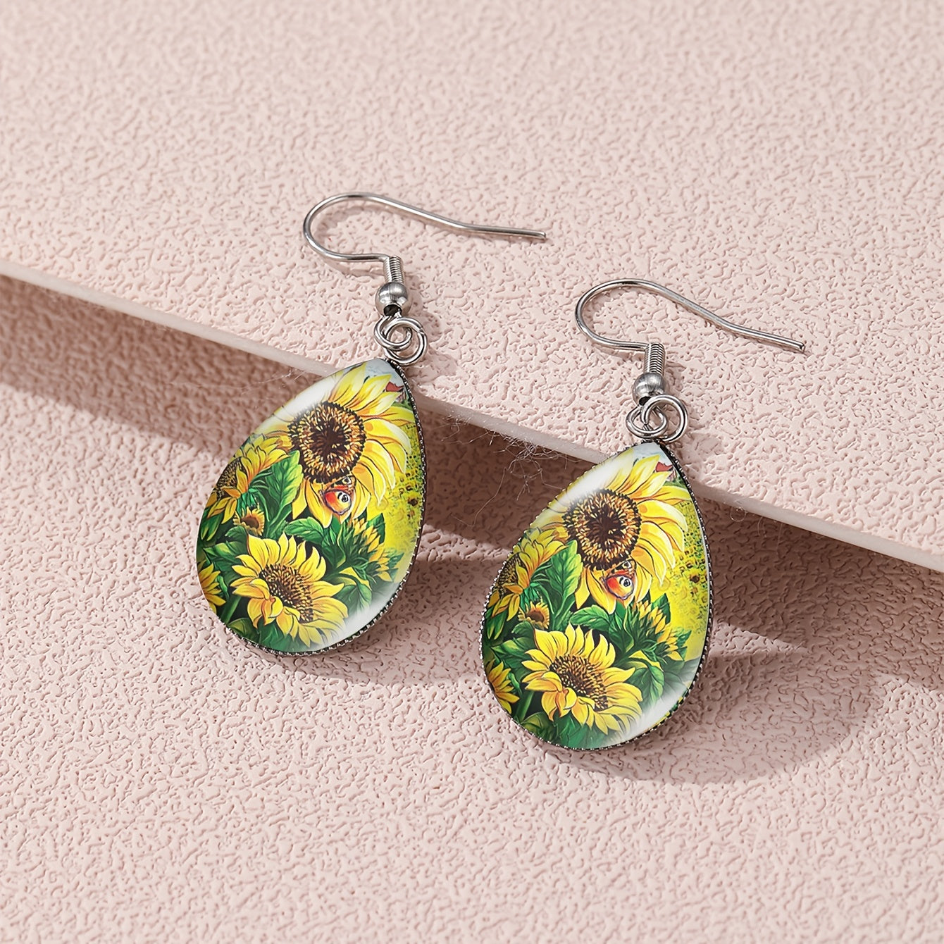 Elegant Sunflower & Hummingbird Water Drop Earrings - Stainless Steel Posts, Glass Material, Perfect for Casual Attire, Pair, Elegant Style