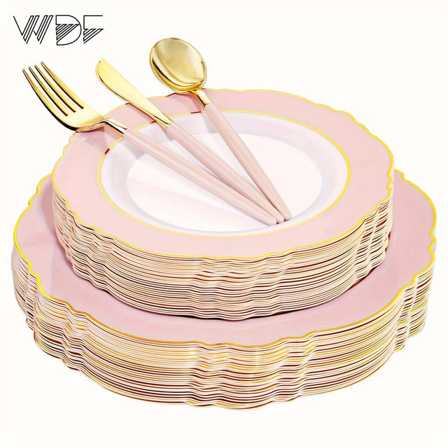 [30 Guests Pink Plastic Dinnerware] WDF 30 Guests Pink Plastic Plates & Golden Plastic Silverware With Pink Handle-Baroque Pink &Golden Plastic Dinnerware For Upscale Wedding &Parties