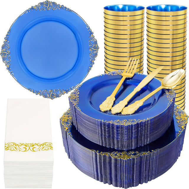 350PCS Blue Plastic Plates - Blue Plastic Dinnerware Sets for 50 Guests - 100 Blue Disposable Party Plates, 150Gold Plastic Silverware, 50Cups, 50Napkins for Wedding & Party