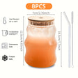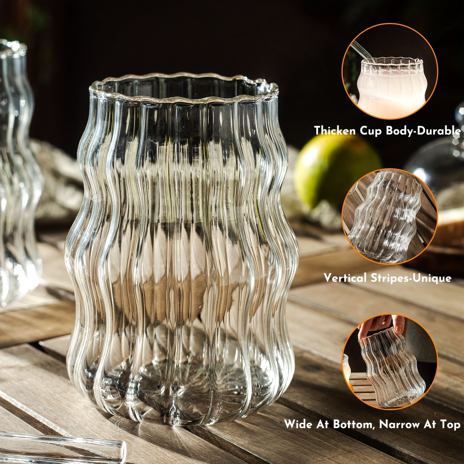 8PCS, Ribbed Drinking Glass Cups with Straws Set, 18 oz Aesthetic Iced Coffee Glasses, Wave Bubble Glasses Tumbler, Ripple Glassware, Beer Glasses for Coctail, Milk, Soda, Gift with Brush