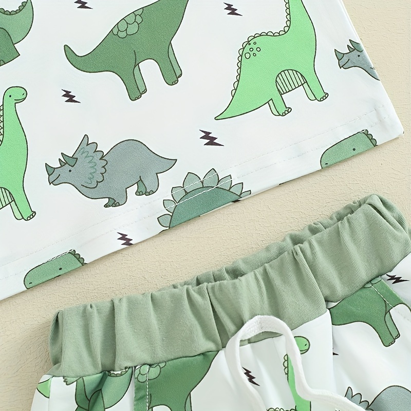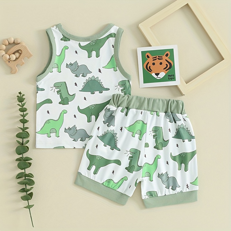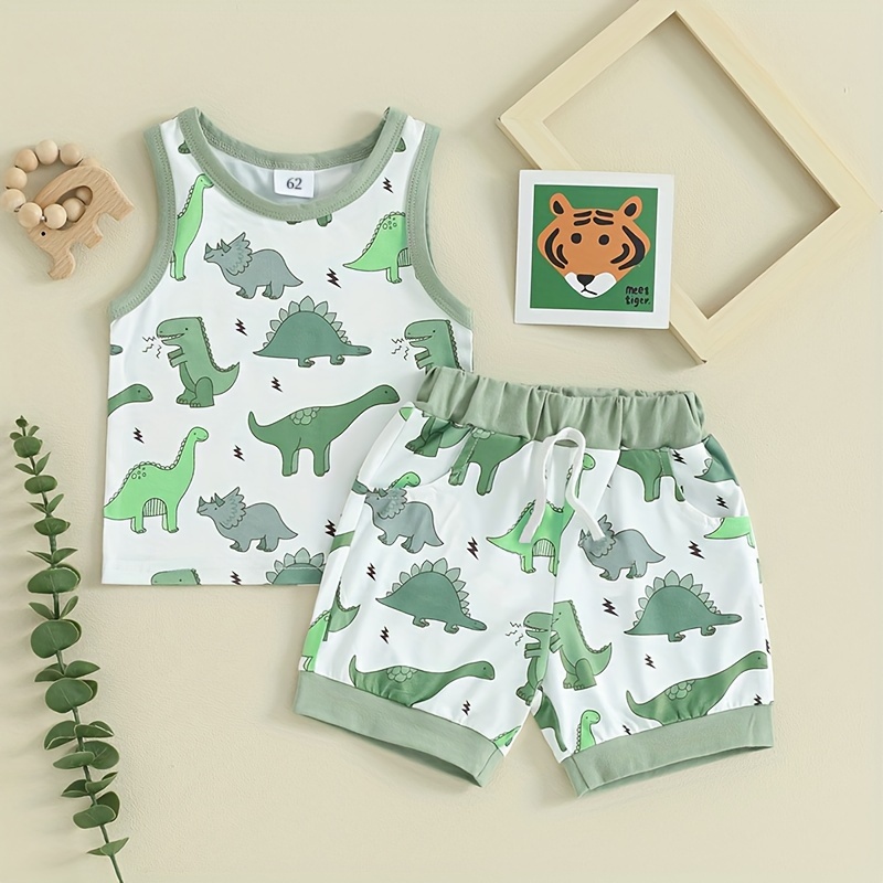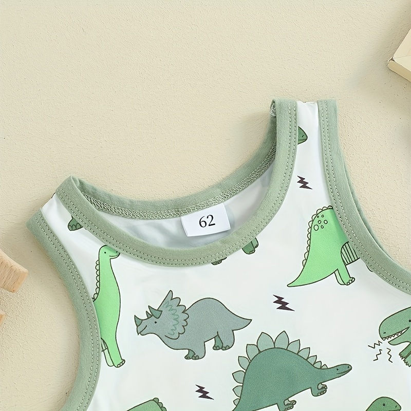 2-Piece Toddler Boys Set, Summer Outfit, Elastic Waist, Crew Neck Tank Top + Shorts, Casual Dinosaur Print Clothing Set