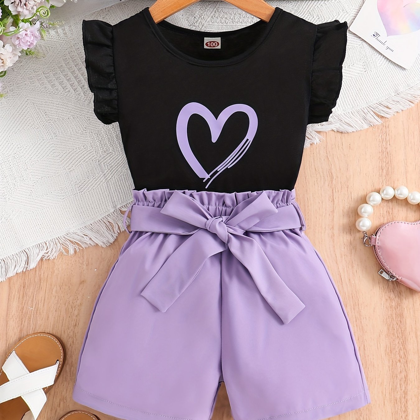 2pcs Girls Daily Casual Heart Print Crew Neck Sleeveless Top & Bow Shorts With Belt For Summer Kids Clothes