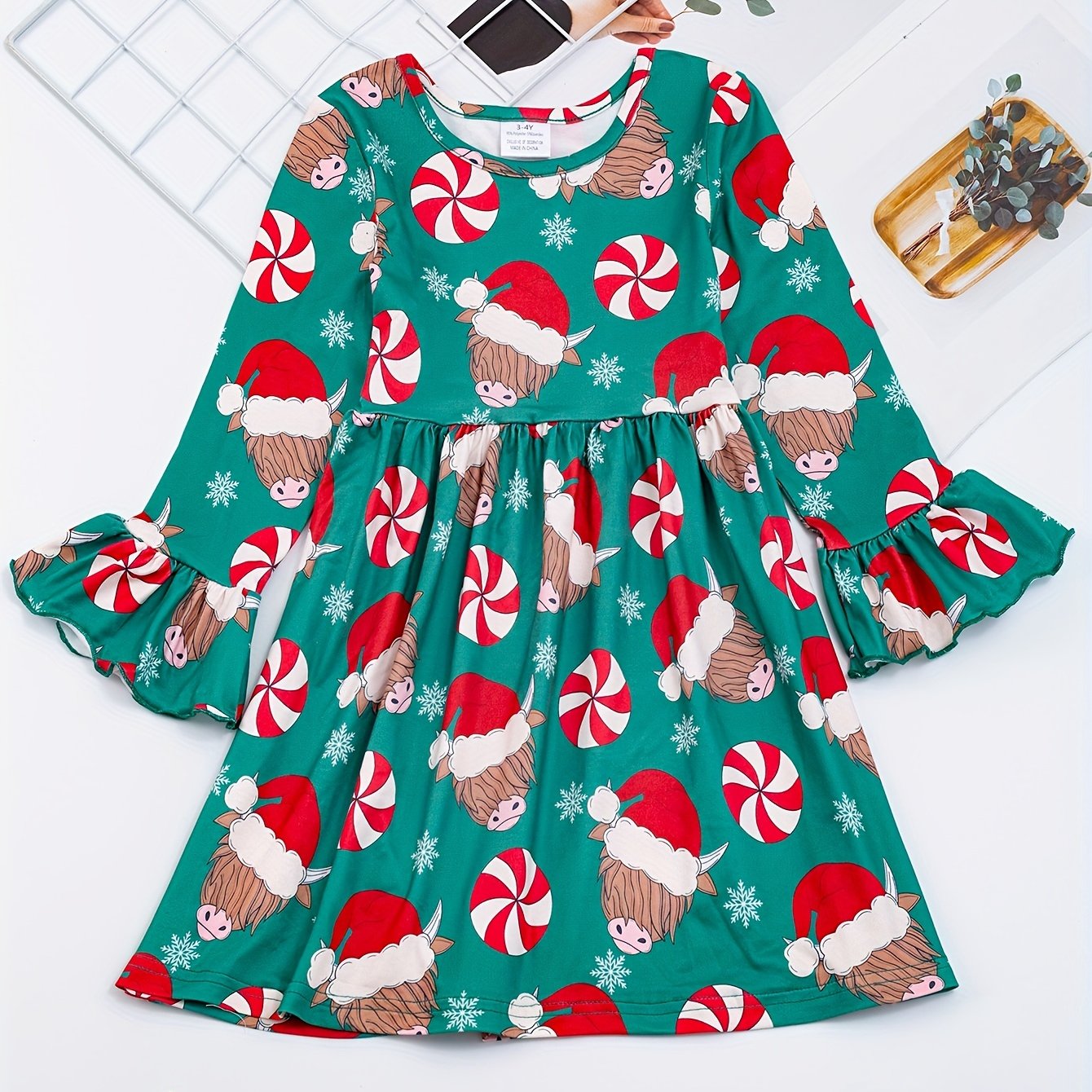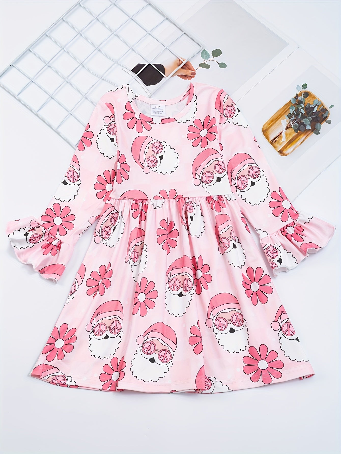 Festive Girls' Christmas Party Dress - Casual & Stretchy Santa Claus & Candy Graphic Kids Clothes for Girls