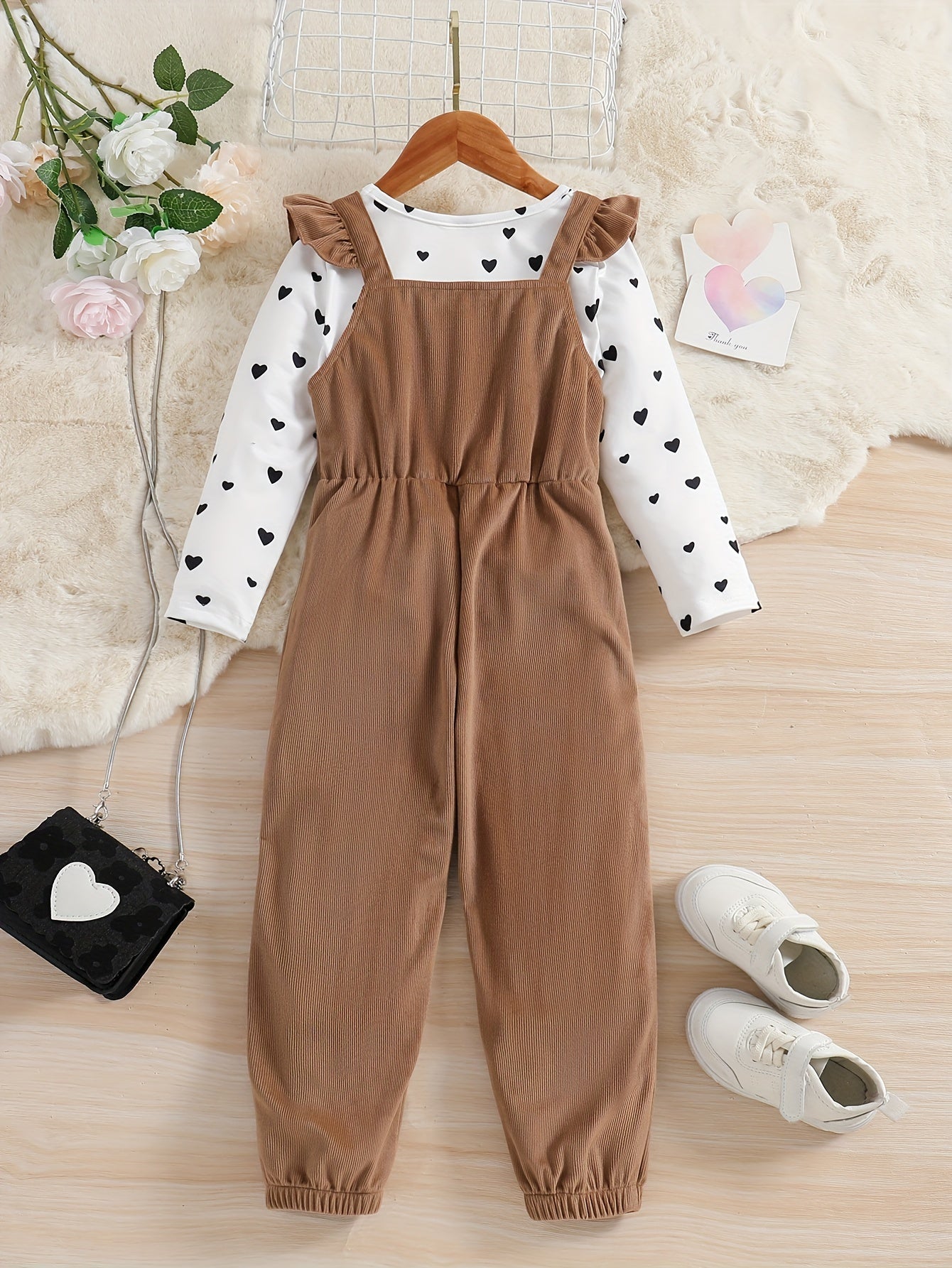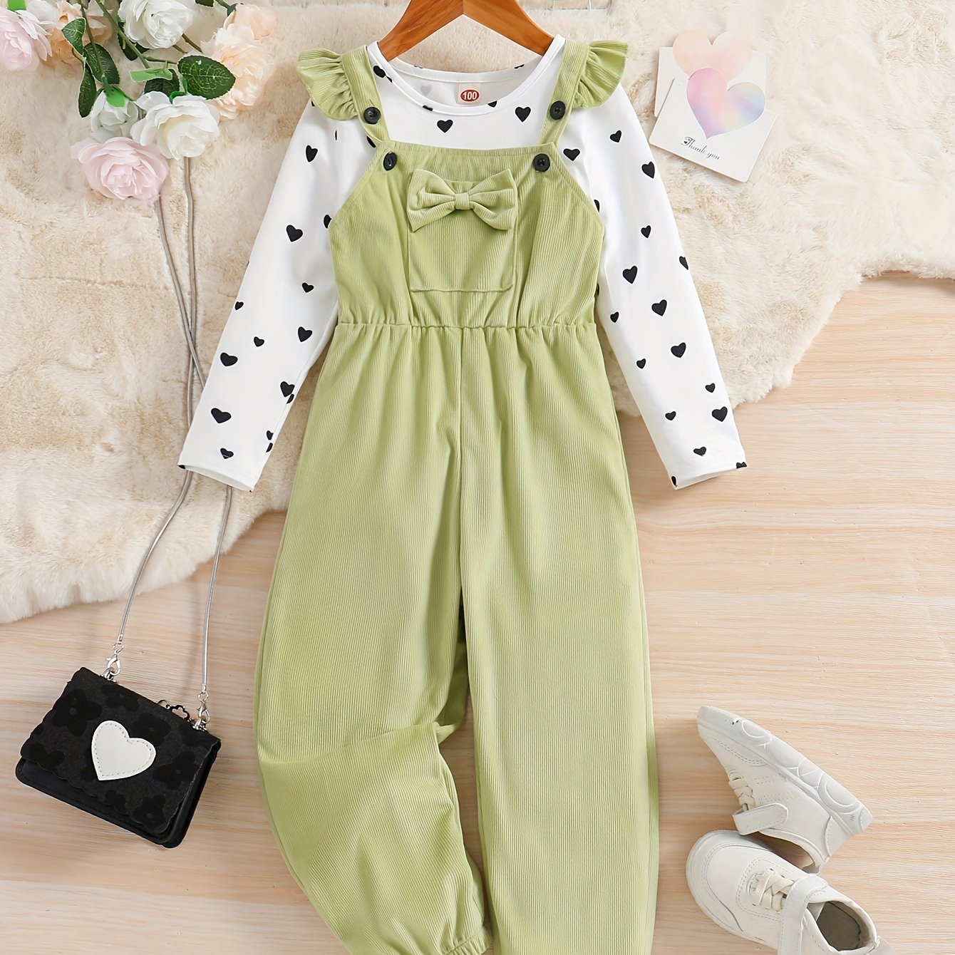 Girl's 2pcs, Bowknot Decor Corduroy Overalls & Heart Allover Print Top Set, Casual Outfits, Kids Clothes For Spring Fall