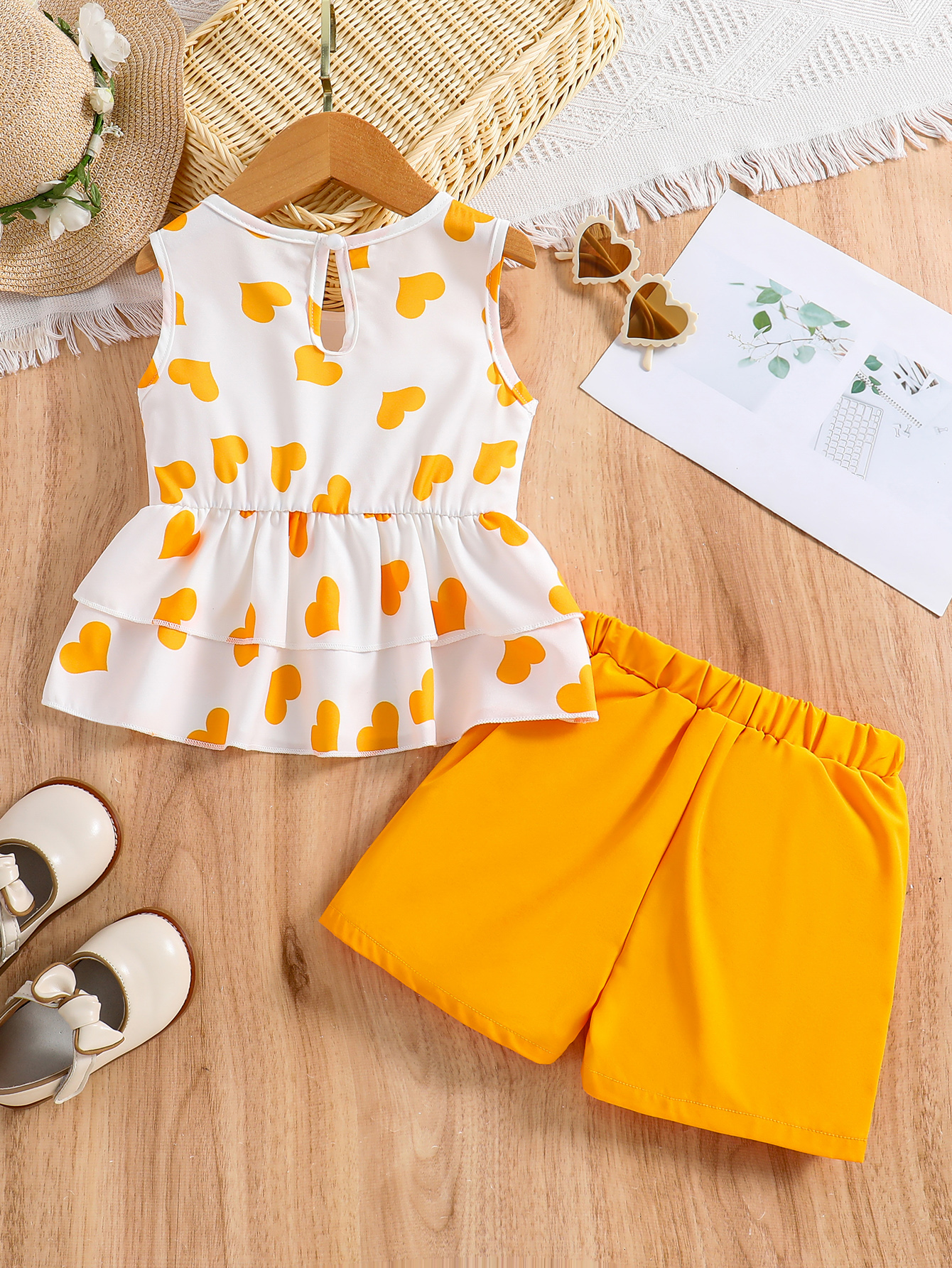 Girls Casual Trendy Cute Heart Graphic Sleeveless Peplum Top & Shorts Set For Summer Holiday Party Kids Clothes