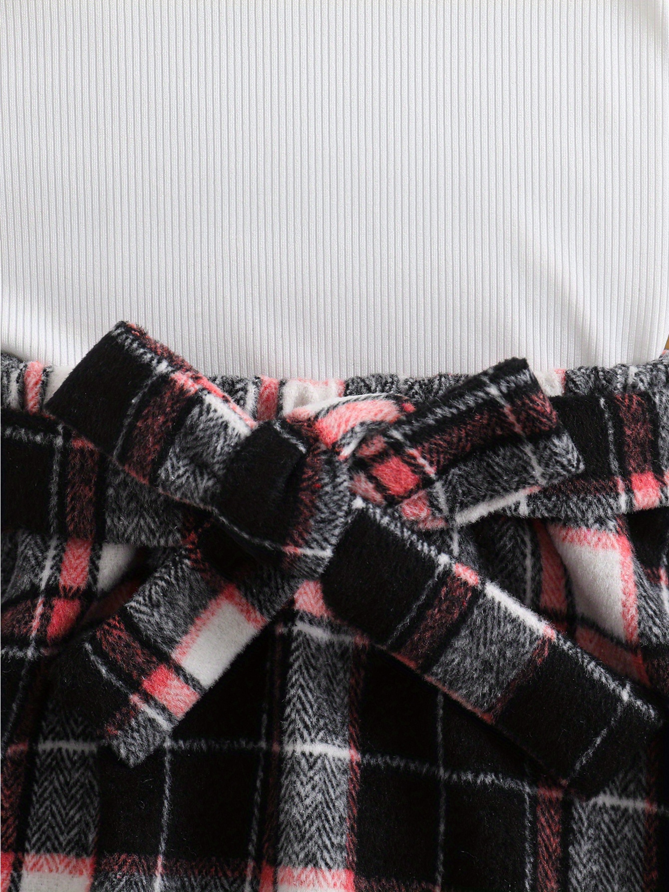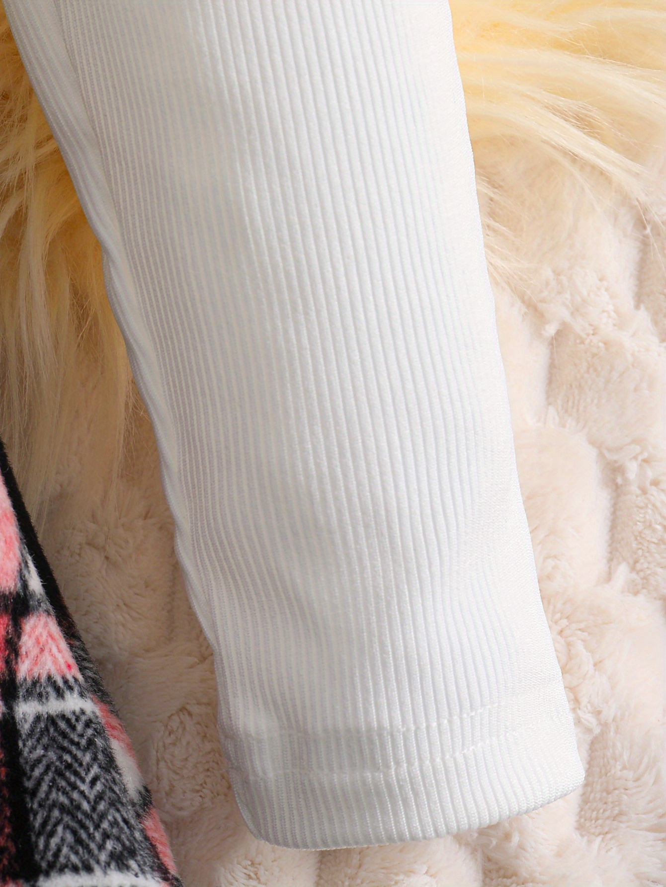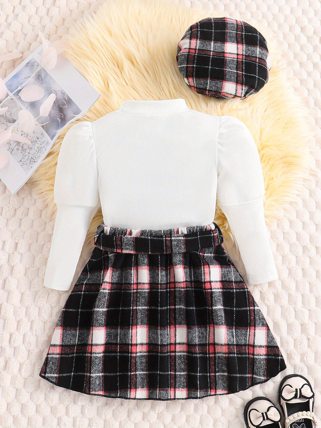 Girl's Trendy 3pcs, Ribbed Long Sleeve Top & Hat & Belted Skirt Set, Plaid Pattern Casual Outfits, Kids Clothes For Spring Autumn - White / 1-2Y is backordered and will ship as soon as it is back in stock.