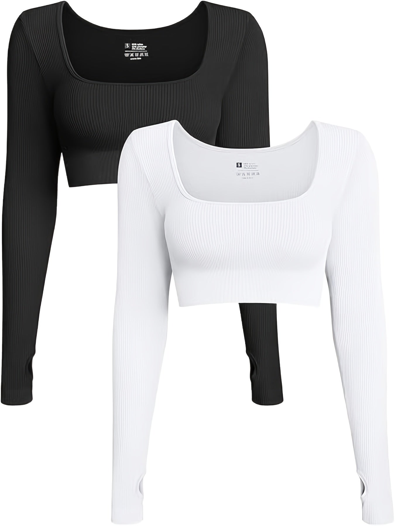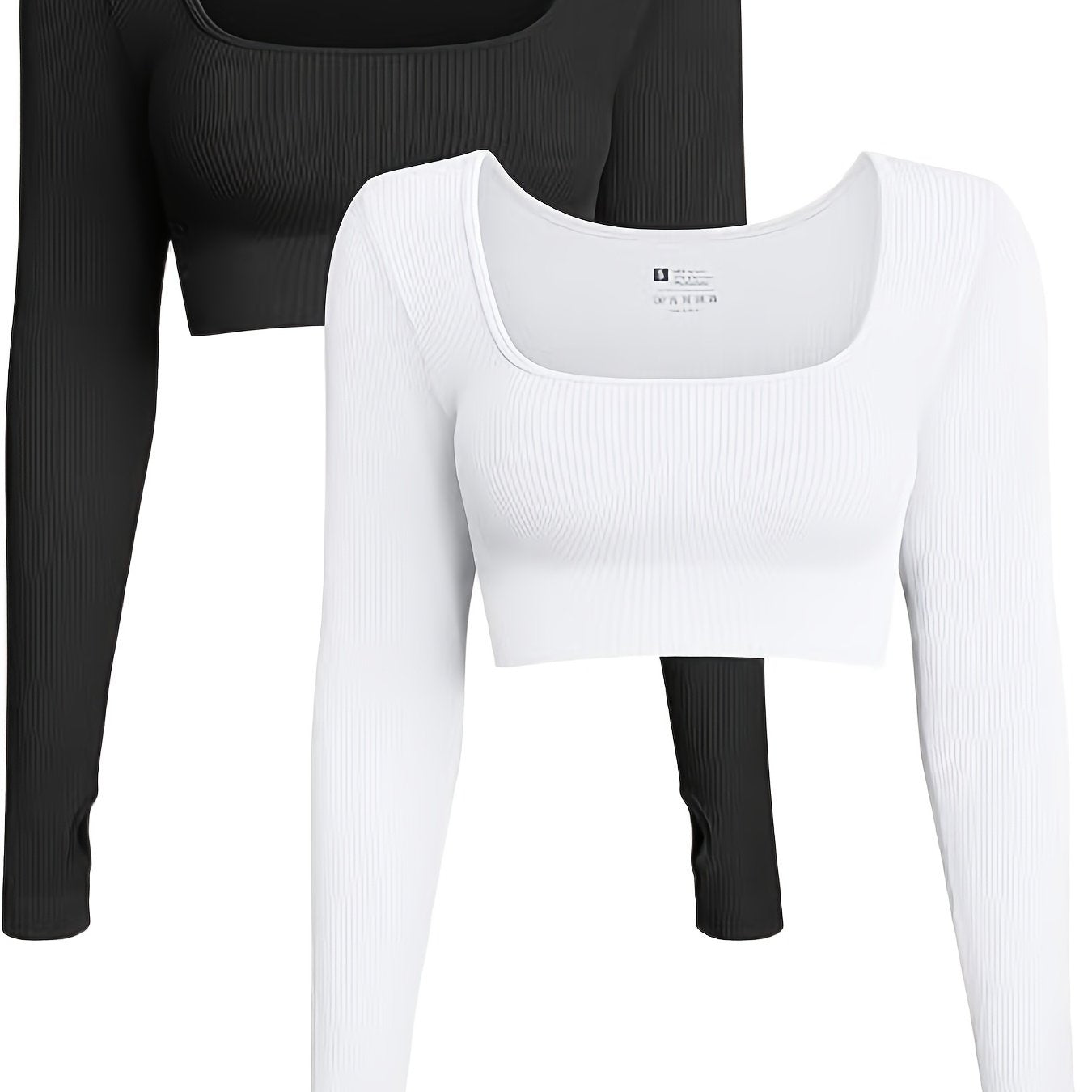 Women'S High-Intensity Yoga & Fitness Long Sleeve Crop Tops - Slimming, Stretchy, Four Seasons, Versatile Wear (2pcs Set), High-Waisted Design, Breathable Fabric, No Belt, Stretchy Fabric, Crop Top, Solid Color - Black And White Color / S is backordered and will ship as soon as it is back in stock.
