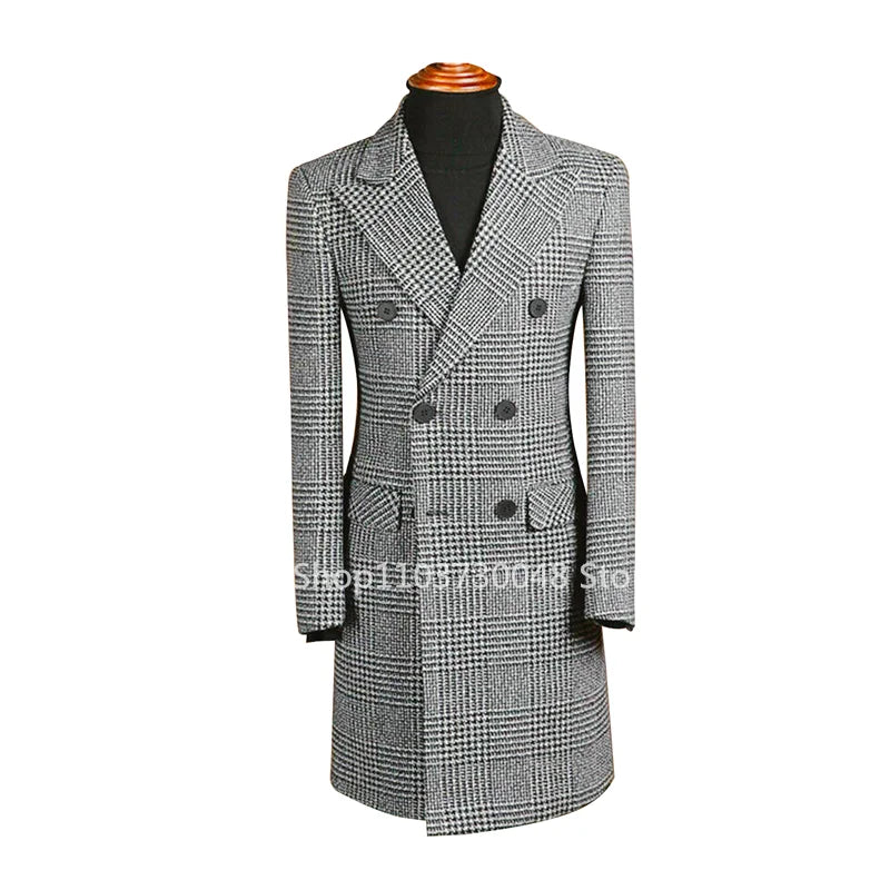 Classic Houndstooth Woolen Blazer for Men with Peak Lapel Double Breasted Dinner Jacket Elegant Suit Coat for Wedding/Business