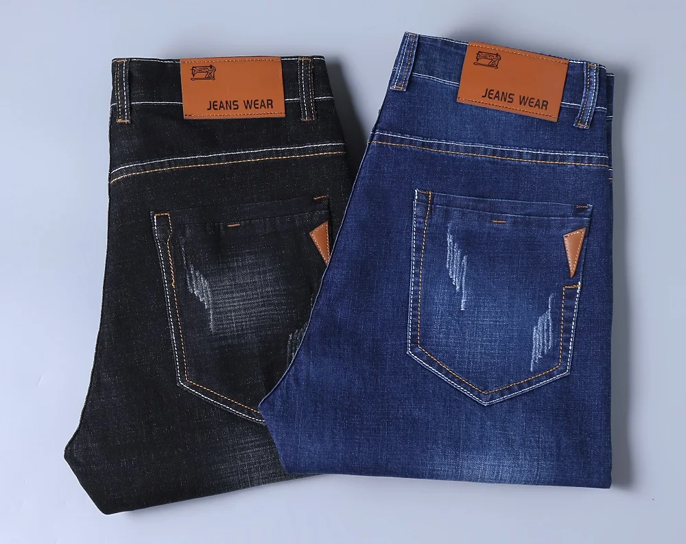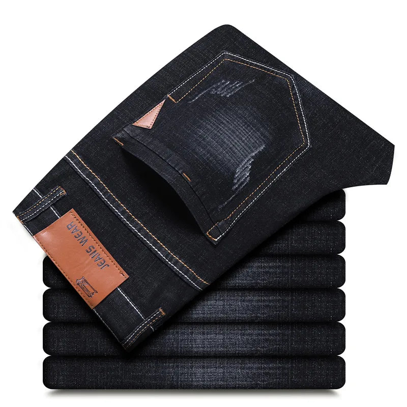 Pure black men's jeans, straight-leg, slim-fit, long pants, four-season, fashionable, trend-setting, versatile, light luxury, business casual daily wear, men's clothing, with弹性, not tight, mid-waist, small straight-leg design, regular thickness