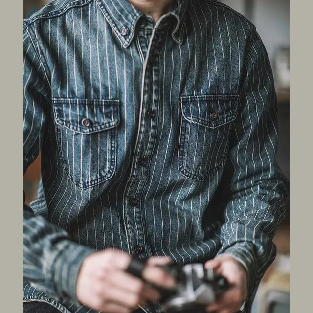 Men's Shirts Long Sleeves Recommend New Sand Washing for Old Retro Trendy Men Thicken Yarn-dyed Striped Shirts for Men