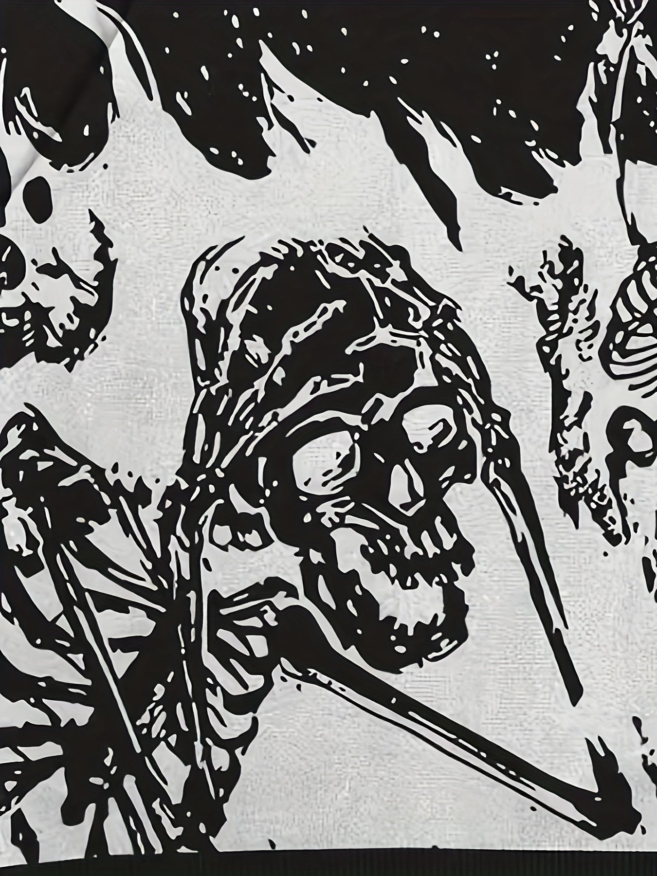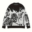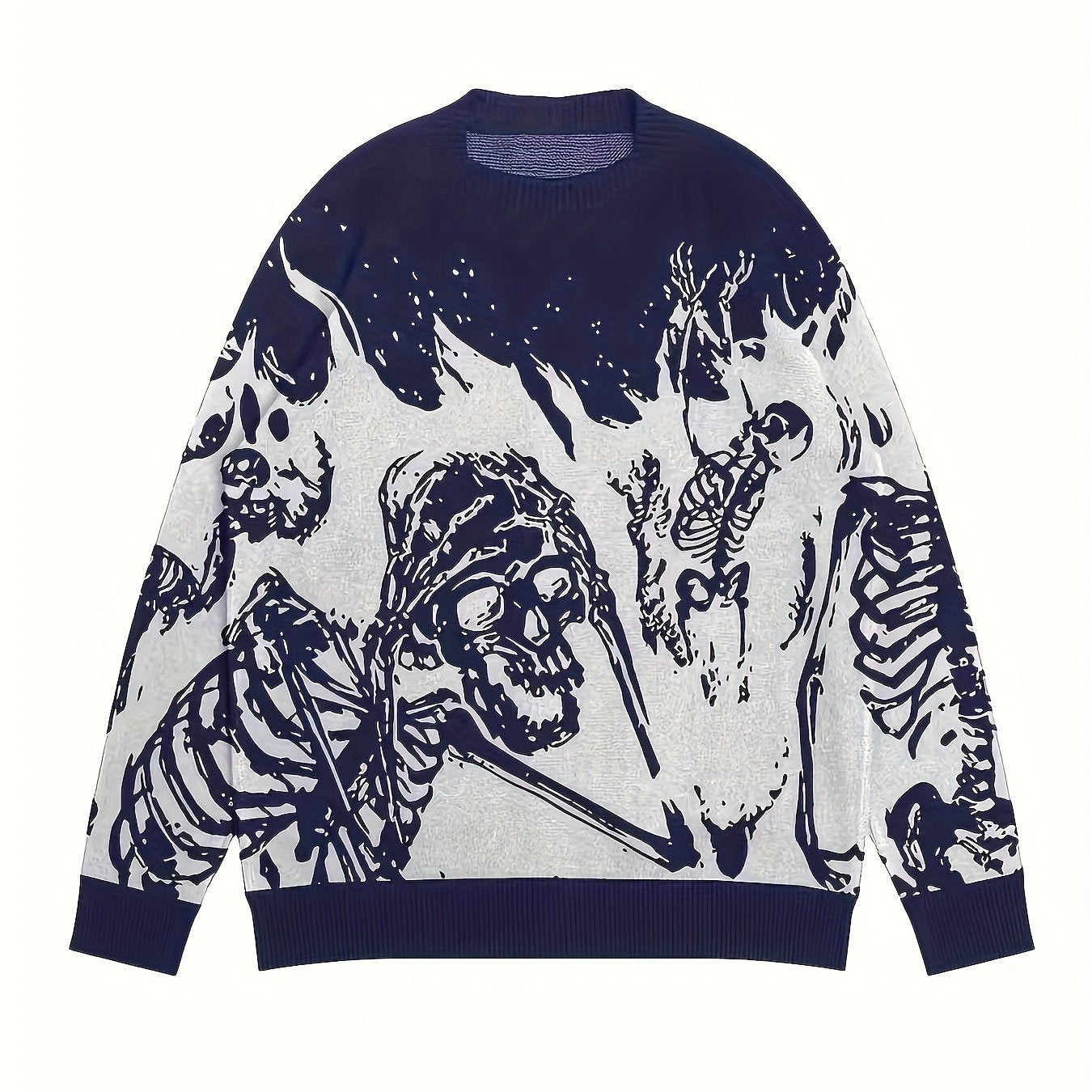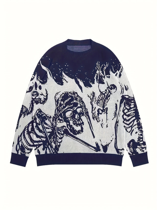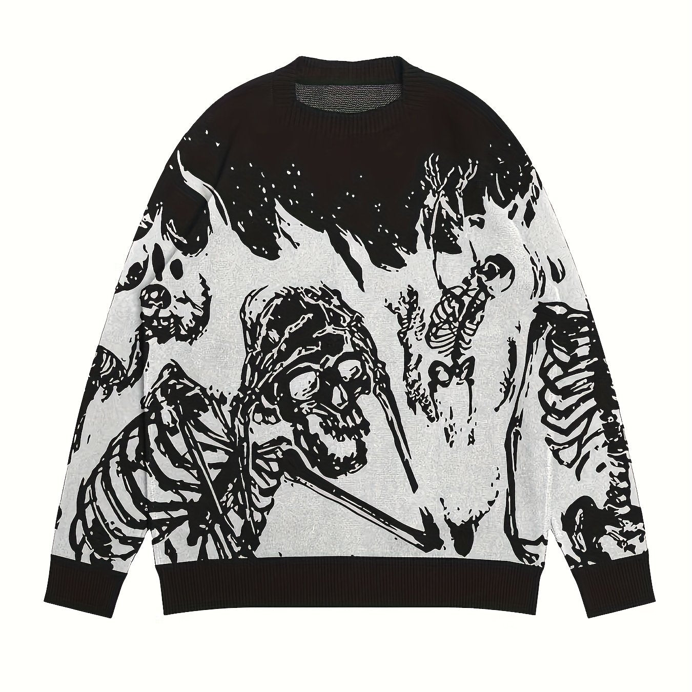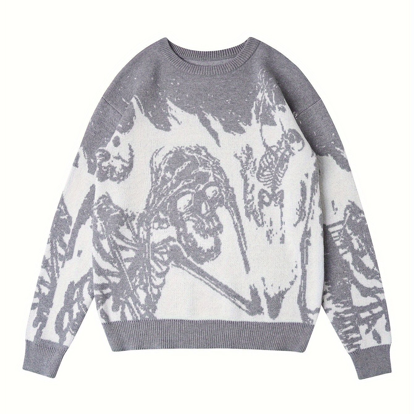 Y2K Long Sleeve Sweater, Loose Casual Sweater Skull Pattern Knitted Sweater, Men's Warm Slightly Stretch Crew Neck Pullover Sweater For Men Fall Winter