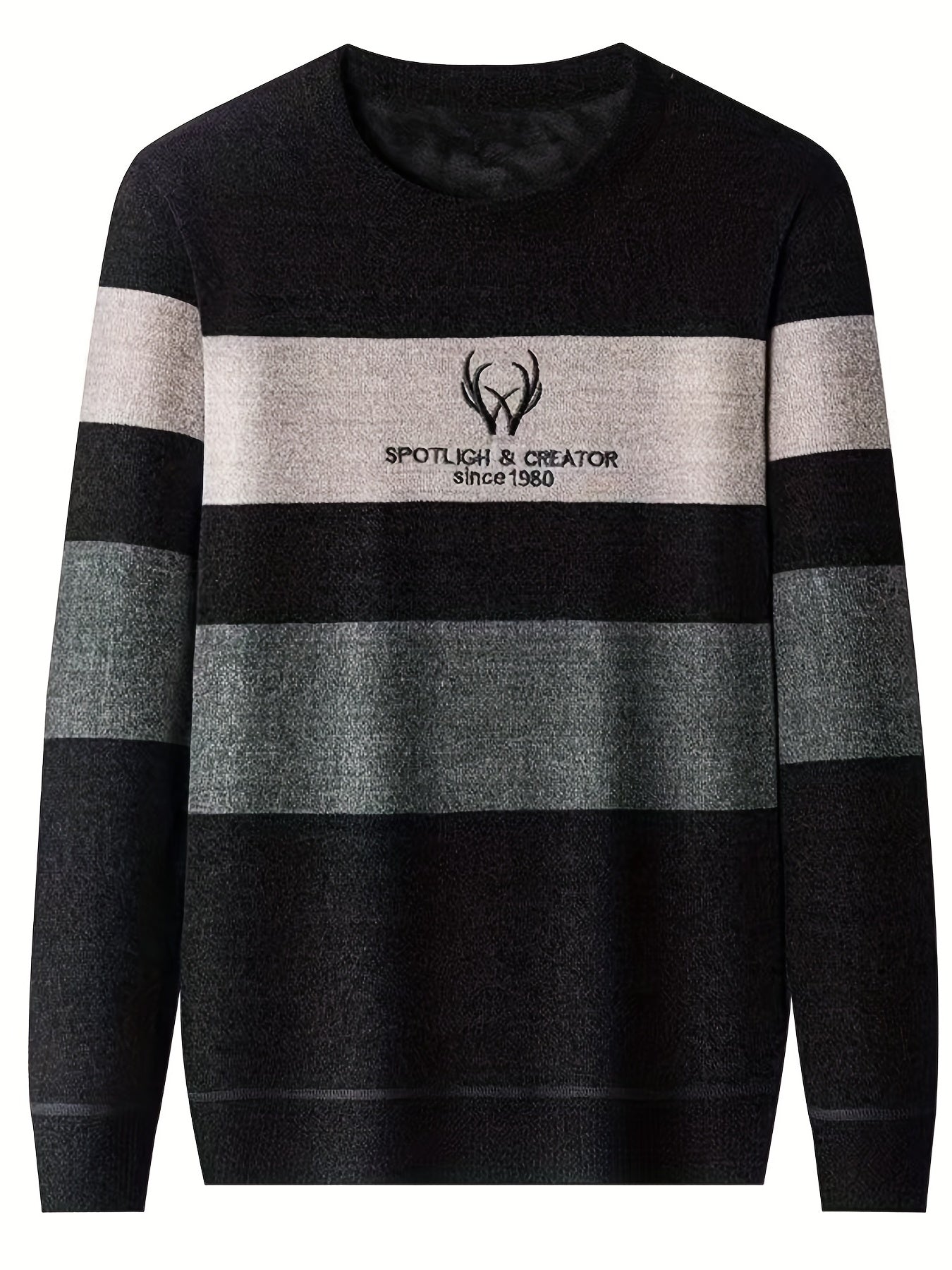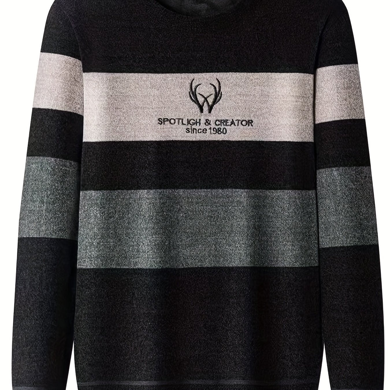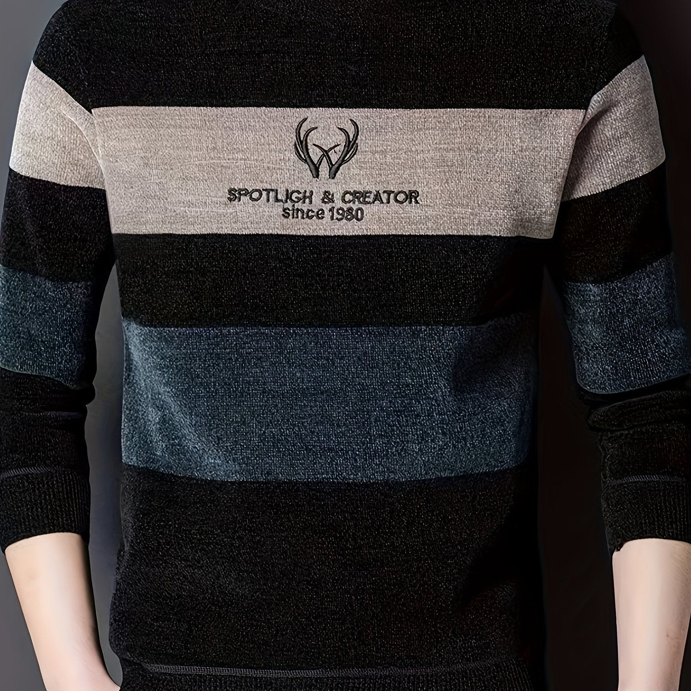 Color Block Knitted Sweater, Men's Casual Warm Mid Stretch Crew Neck Pullover Sweater For Men Fall Winter
