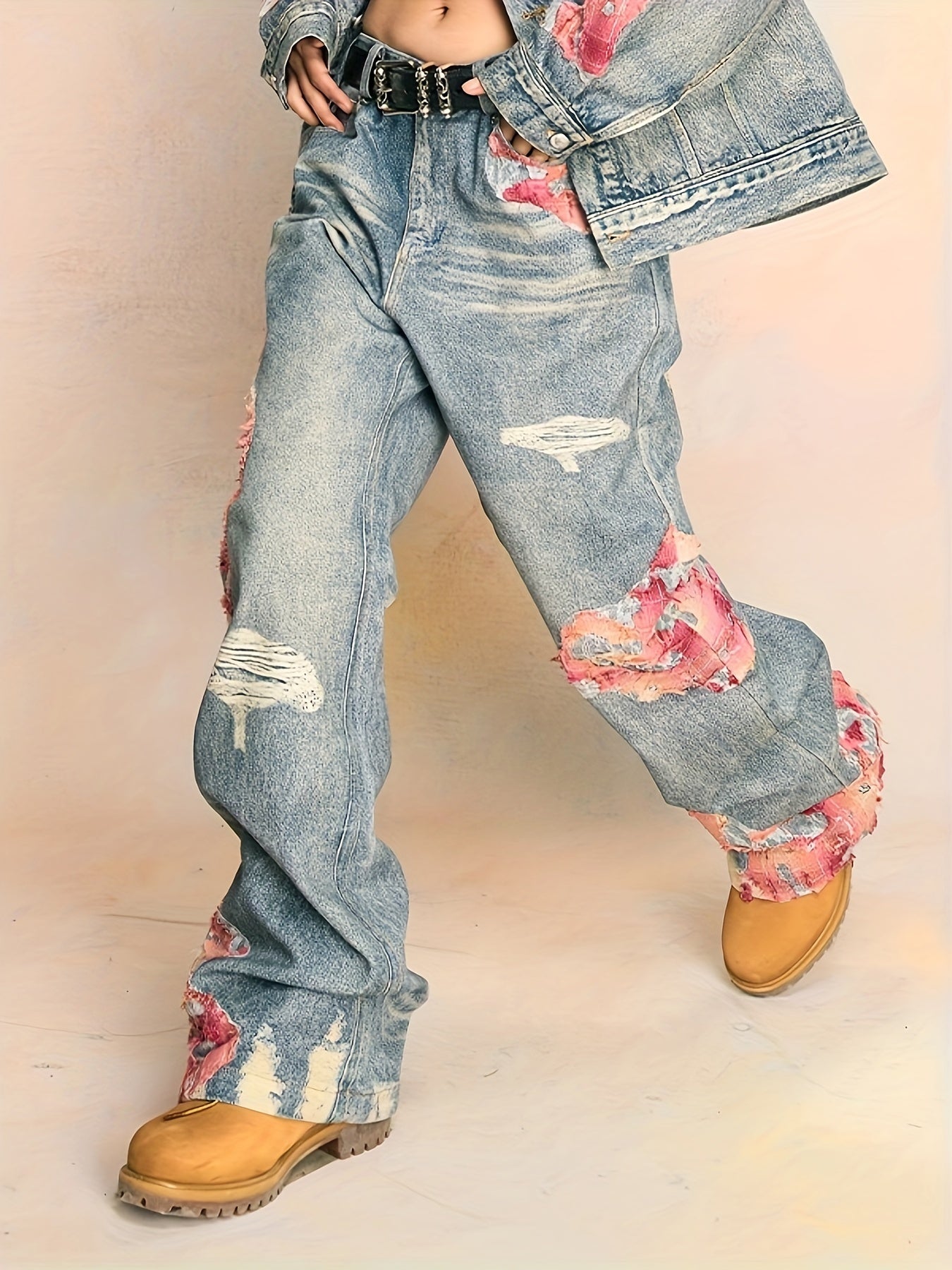 High Street Hip-hop Flared Jeans For Men And Women Summer Street Design LaceSplicing Mopping Pants - Light Blue / S is backordered and will ship as soon as it is back in stock.