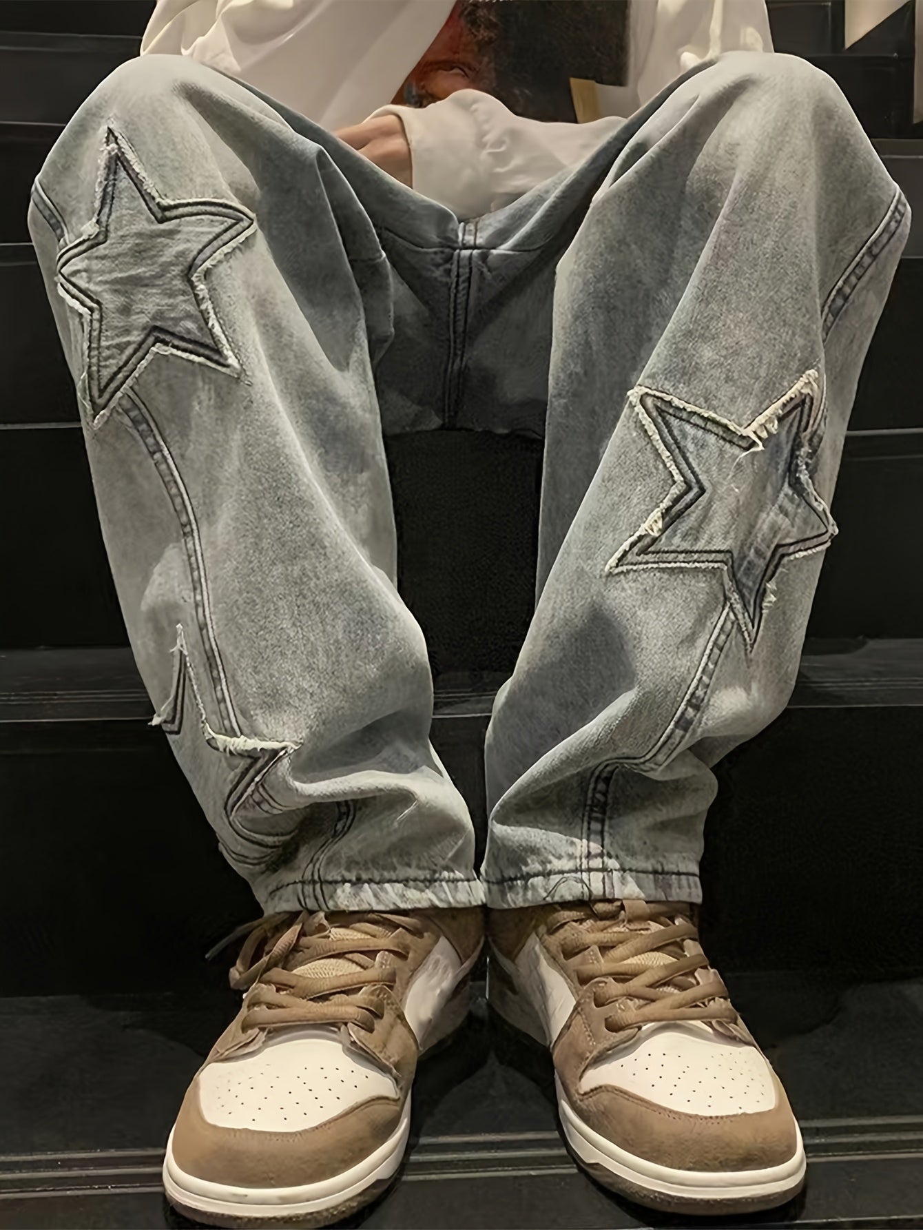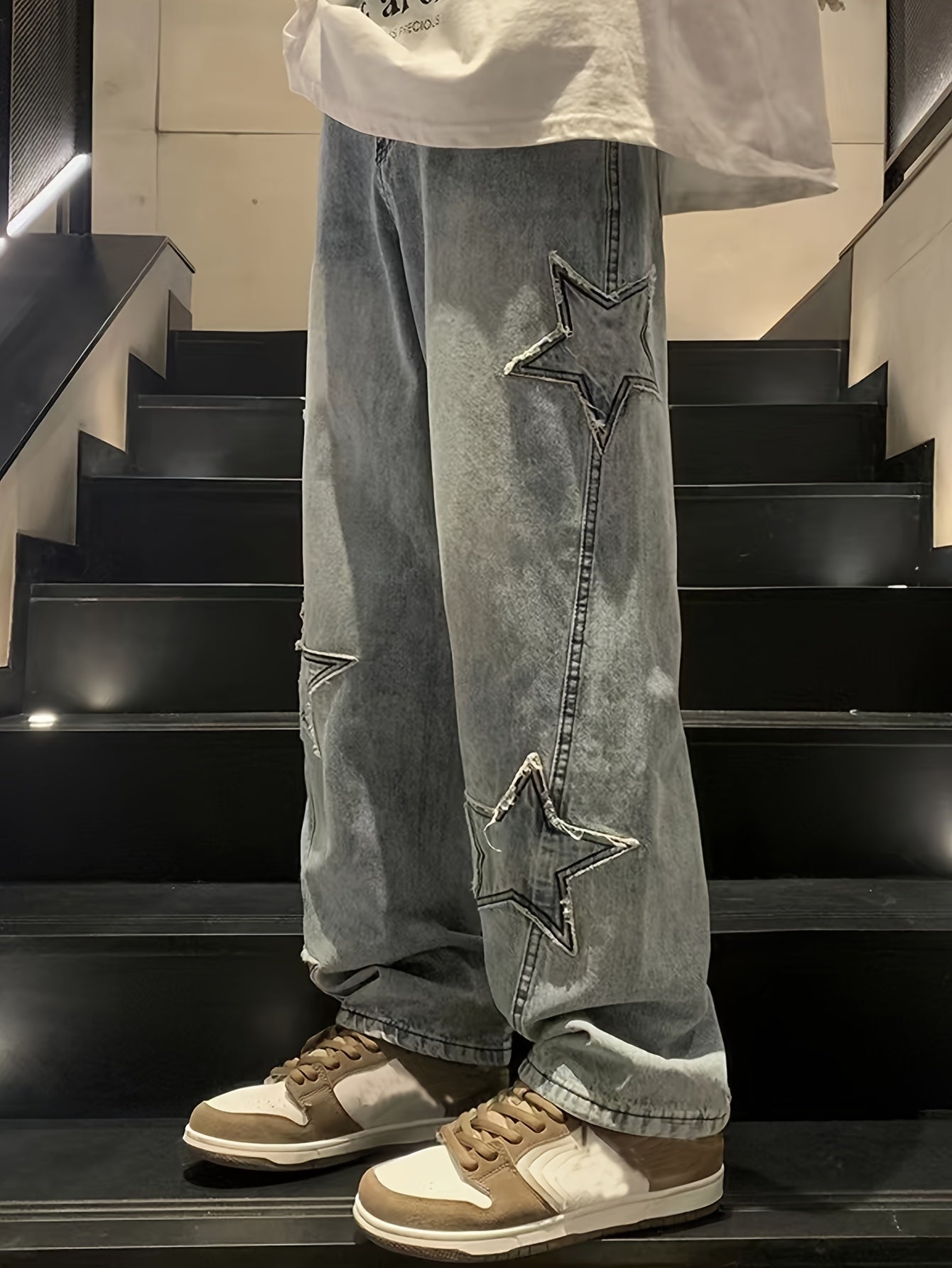 Wide Leg Denim Jeans for Men - Trendy Star Pattern, Washed, Non-Stretch, Loose Fit, Regular Length, Solid Color, Street Style, All-Season Casual Pants