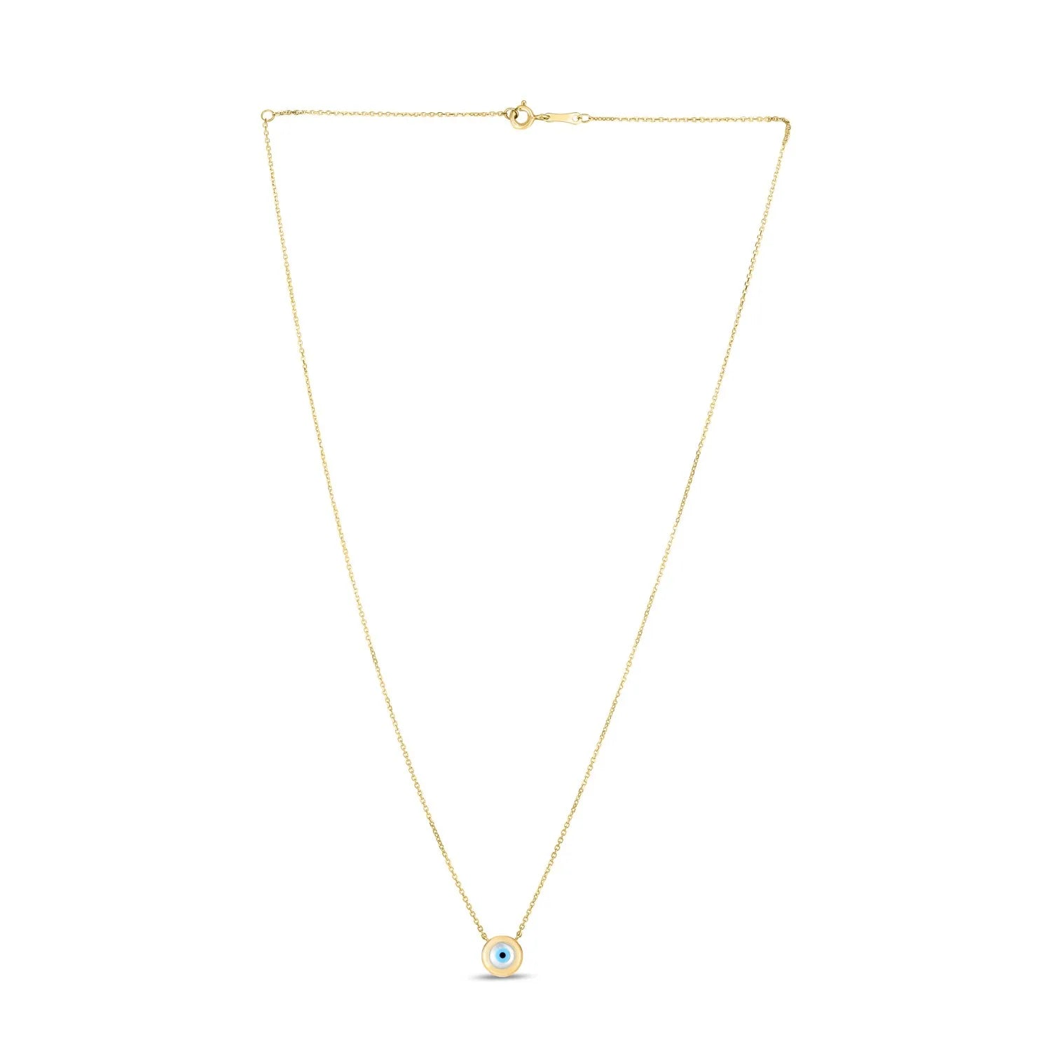 This beautiful 14k yellow gold Mother Of Pearl Evil Eye necklace comes in a high polish finish & closes with a spring clasp. This stunning piece is hand crafted & sits effortlessly between a glimmering rolo chain. Uniquely balanced in the center is a beautiful piece of Mother of Pearl that adds that pop of color to anyones collection. Measuring 18 inches in length.
