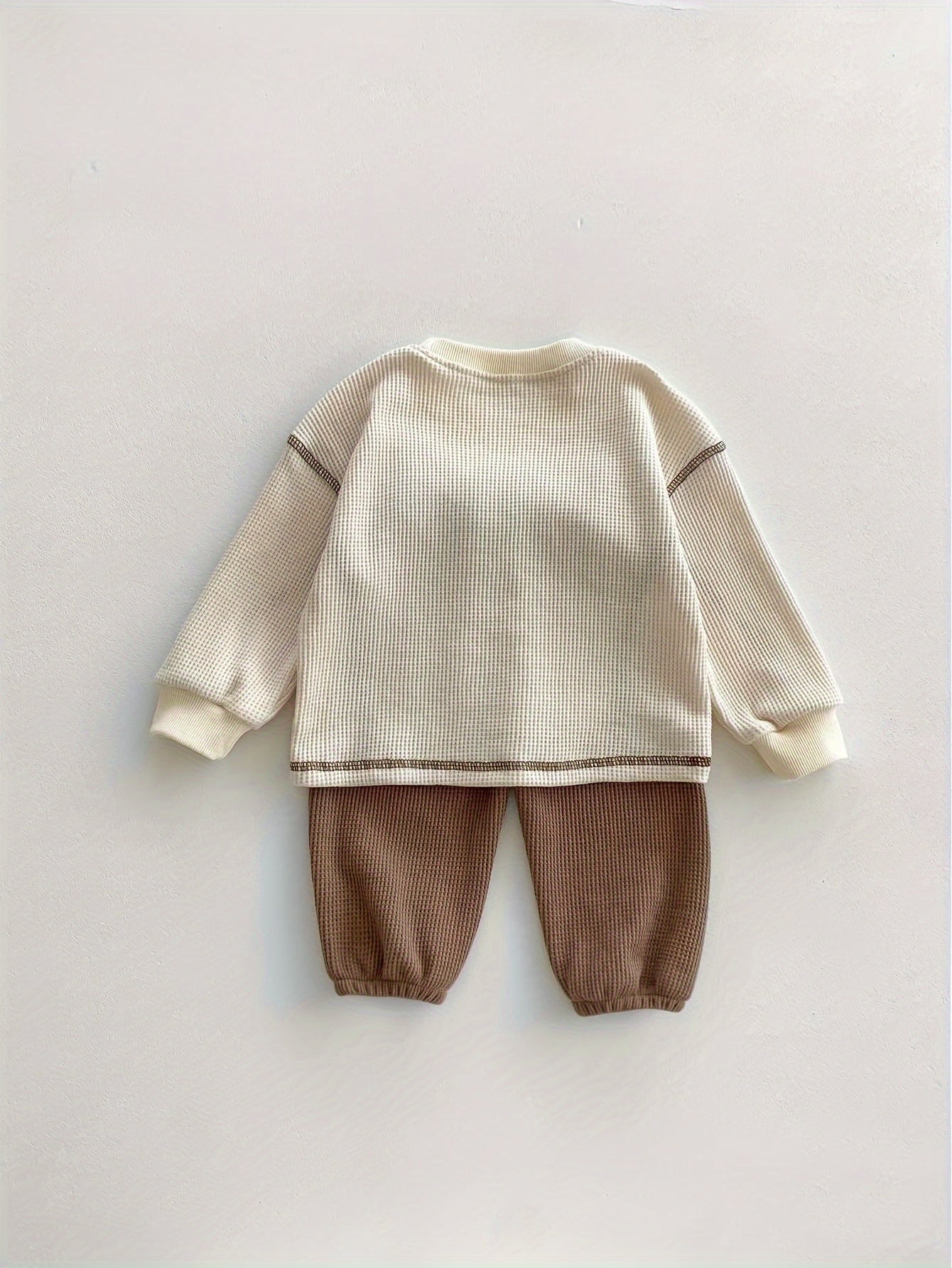 2pcs 2-Piece Waffle Textured Long Sleeve Baby Boy Set: Fall/Spring Casual Tops & Pants