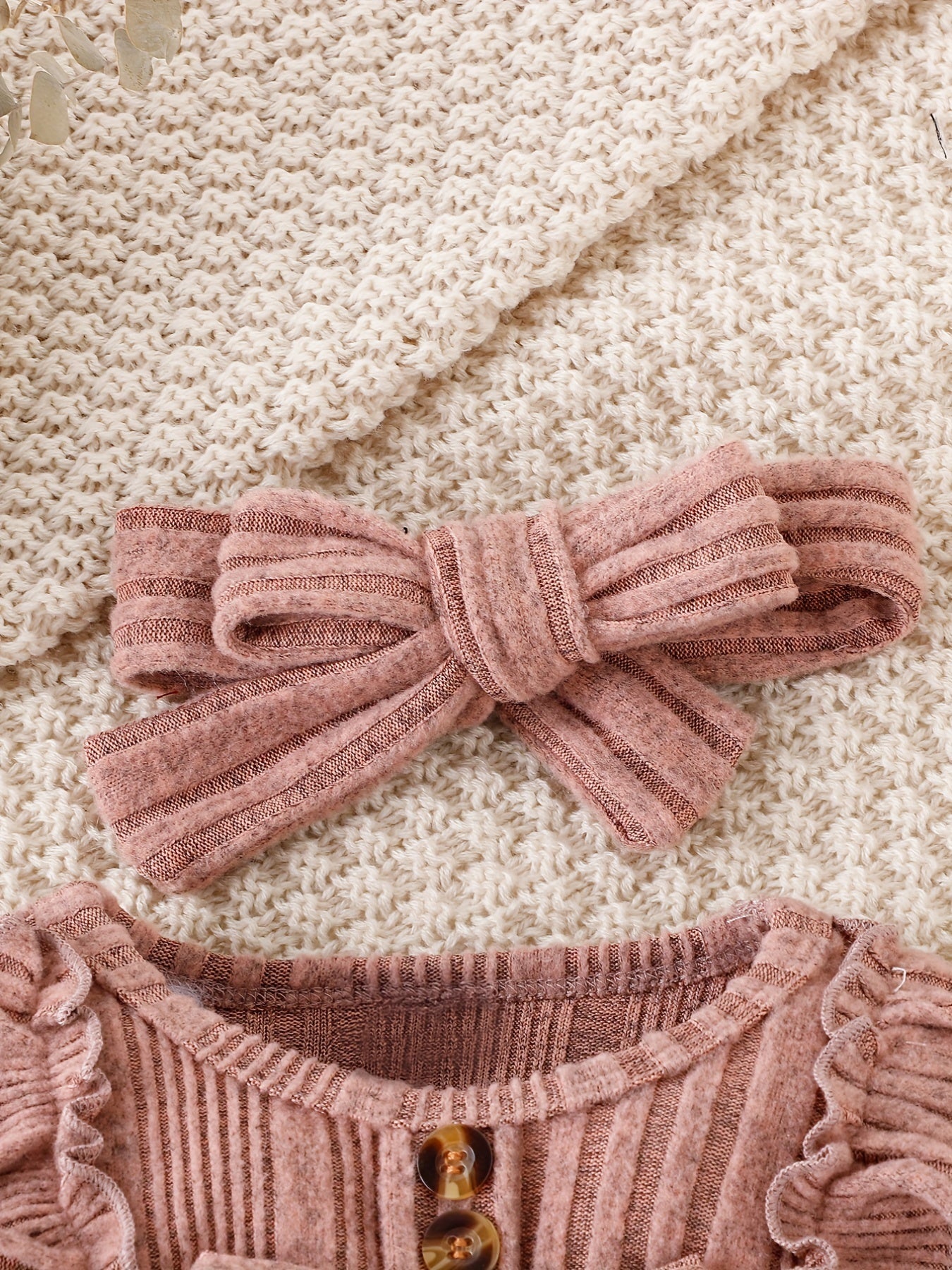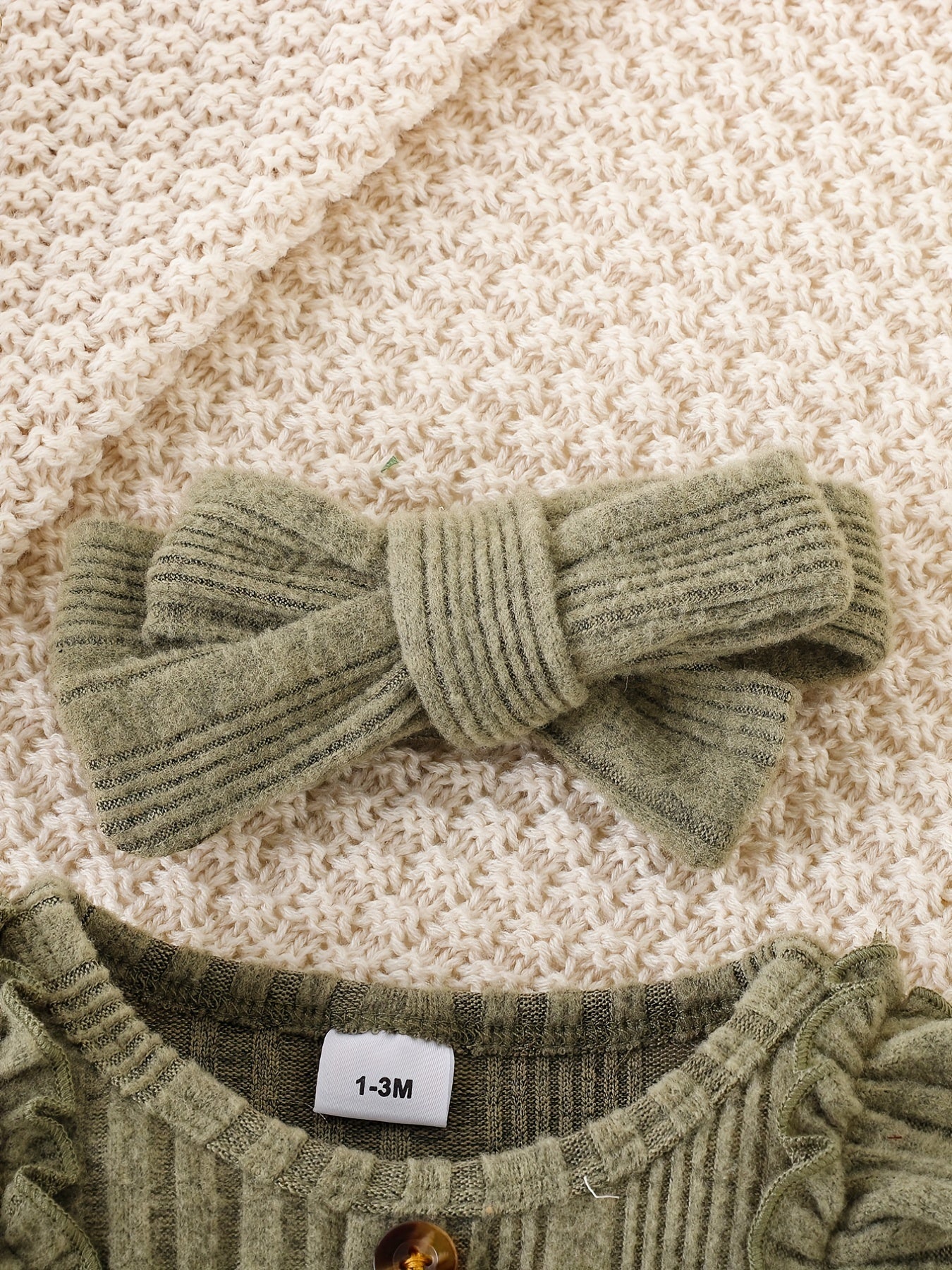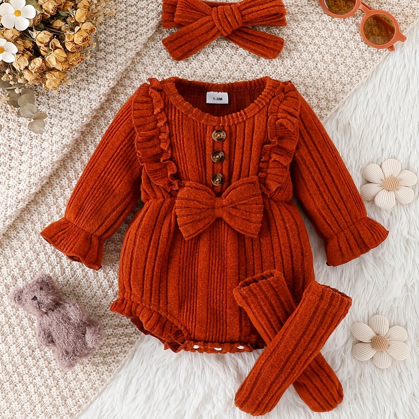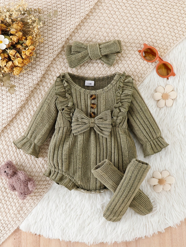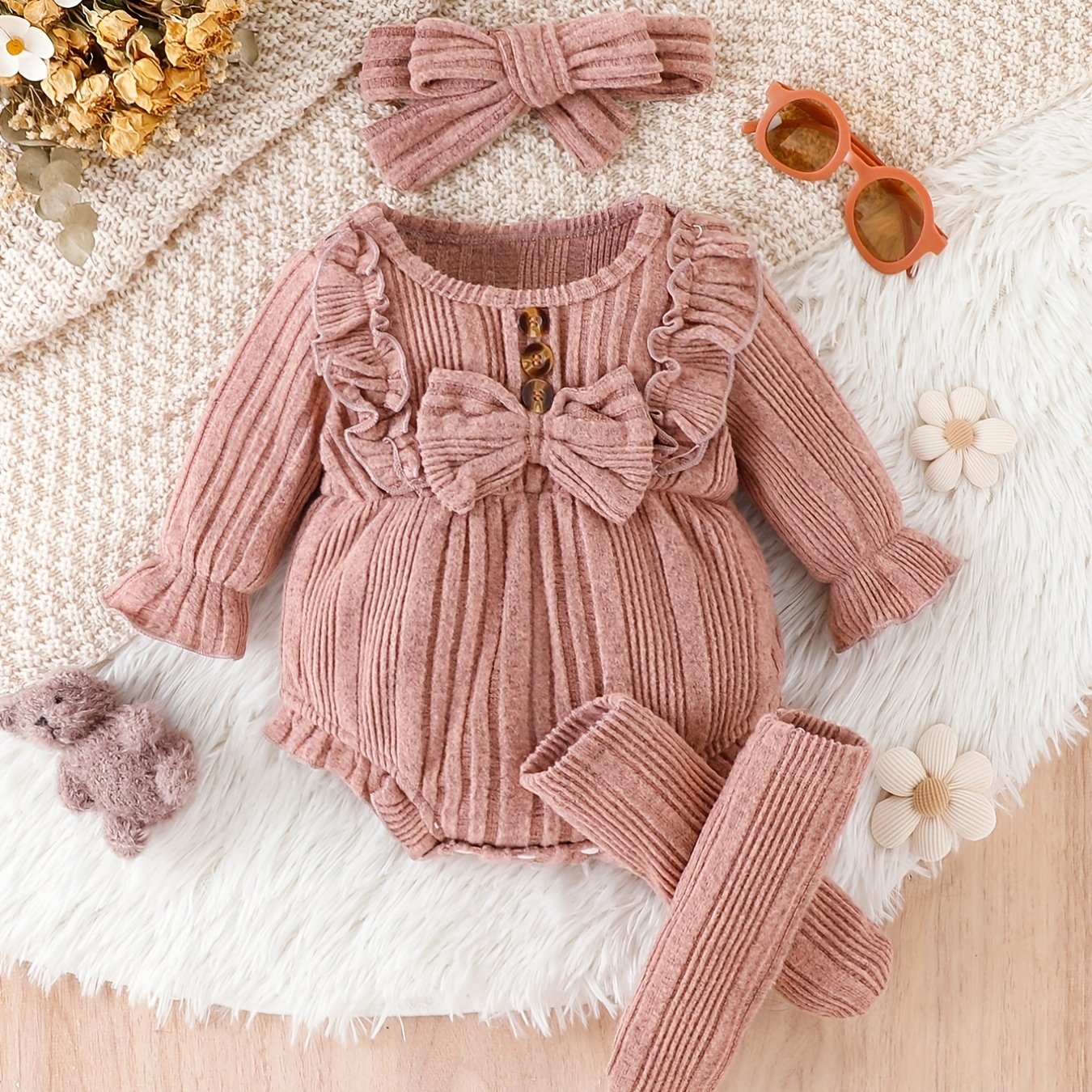 3pcs Baby Girl Ruffled Lace Bow Onesie & Headband & Socks Outdoor Set, Fall Winter Warm Outwear, Pregnant Mom's Gift
