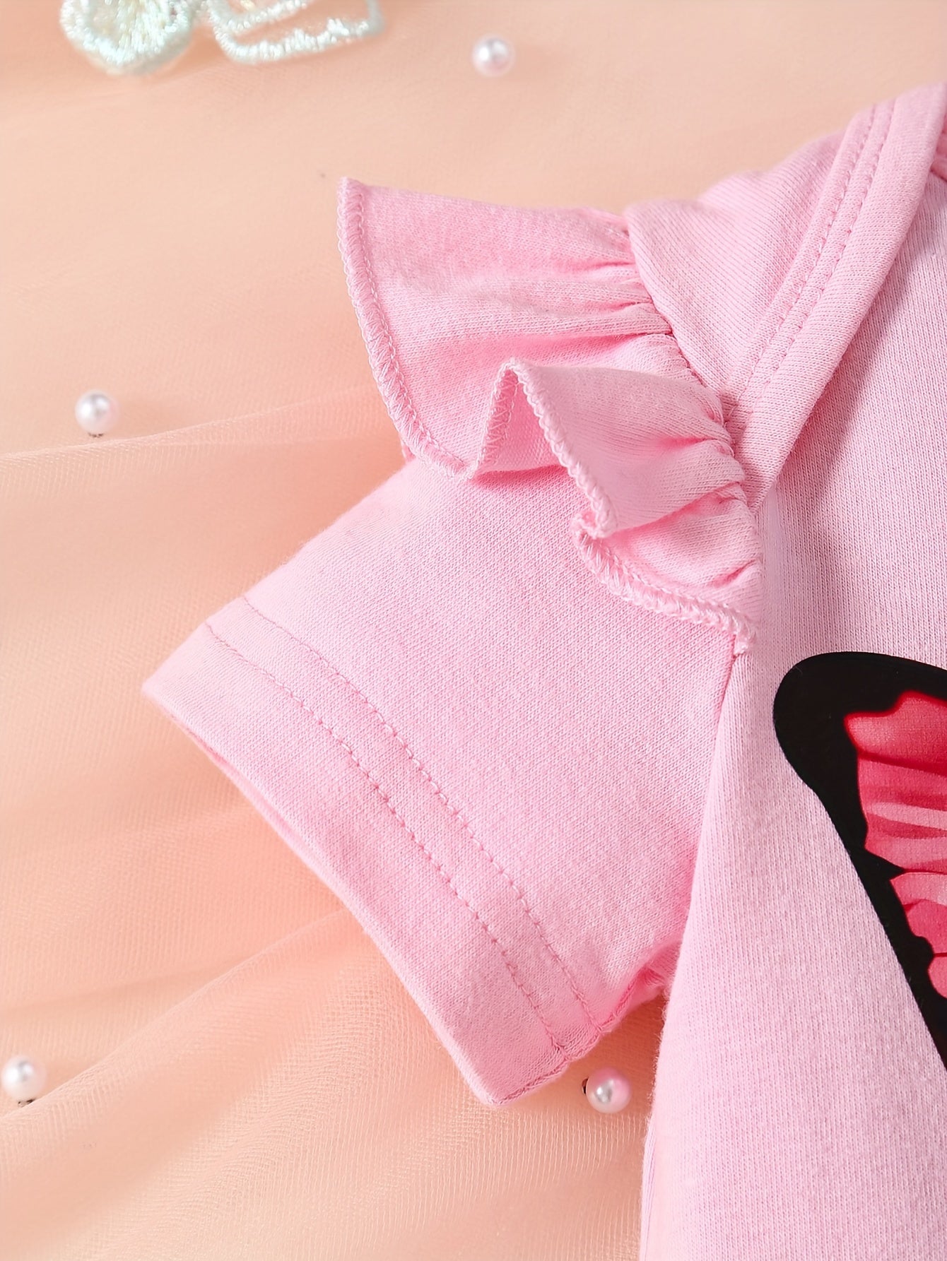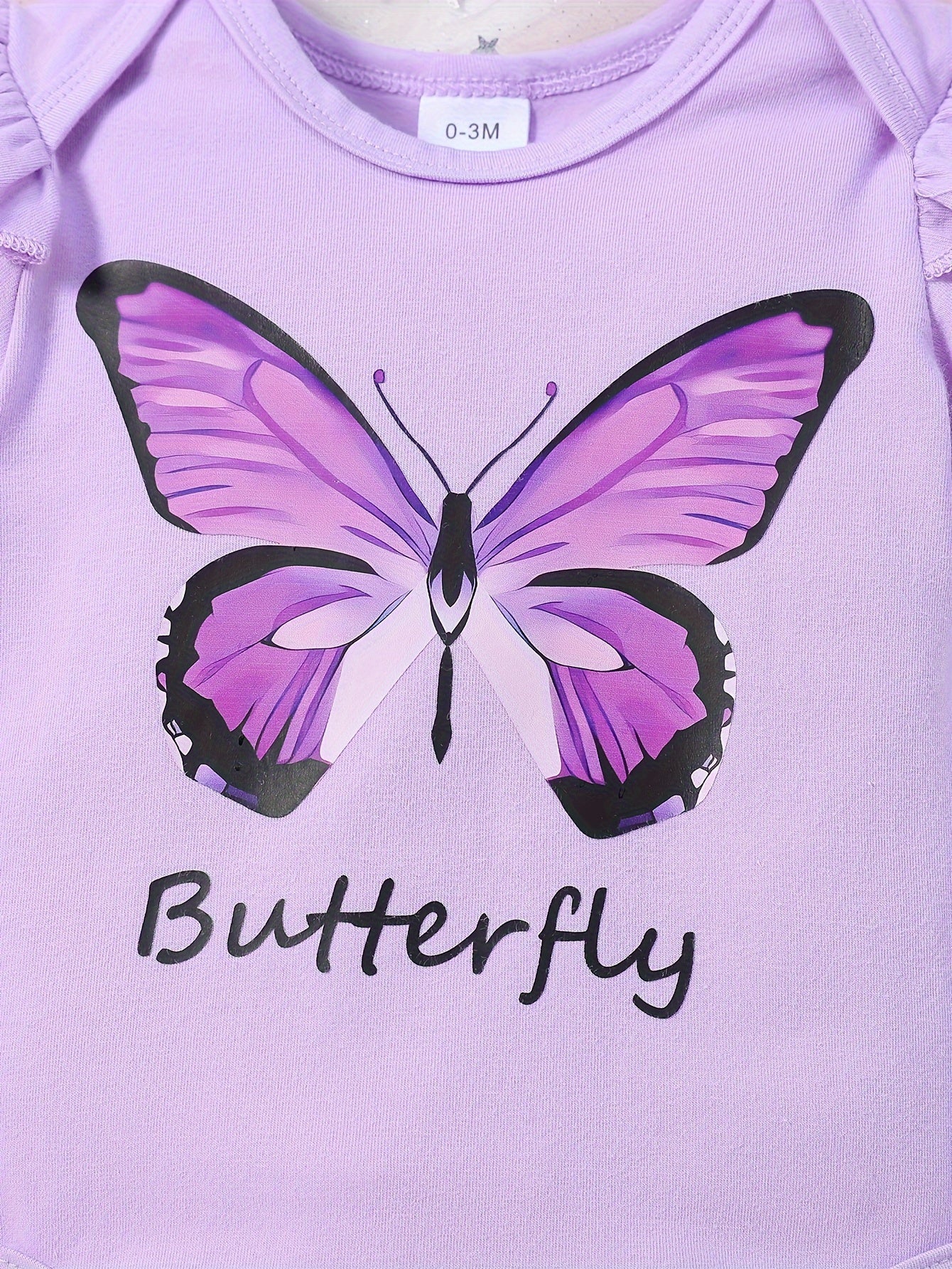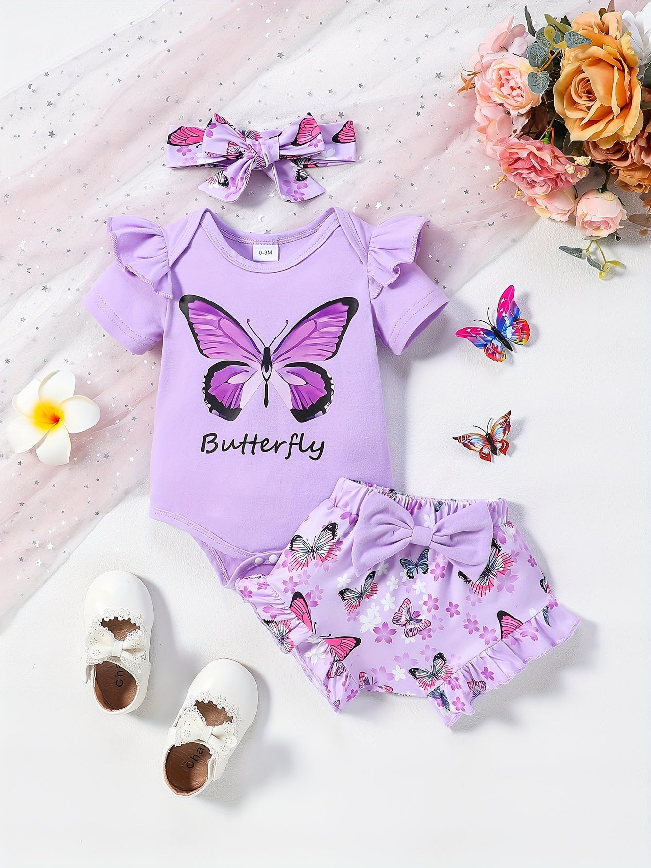 Baby Girl Butterfly Pattern Onesie, bow lace shorts, hair band three-piece set