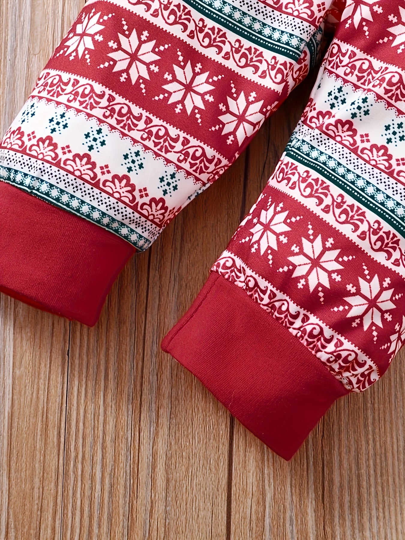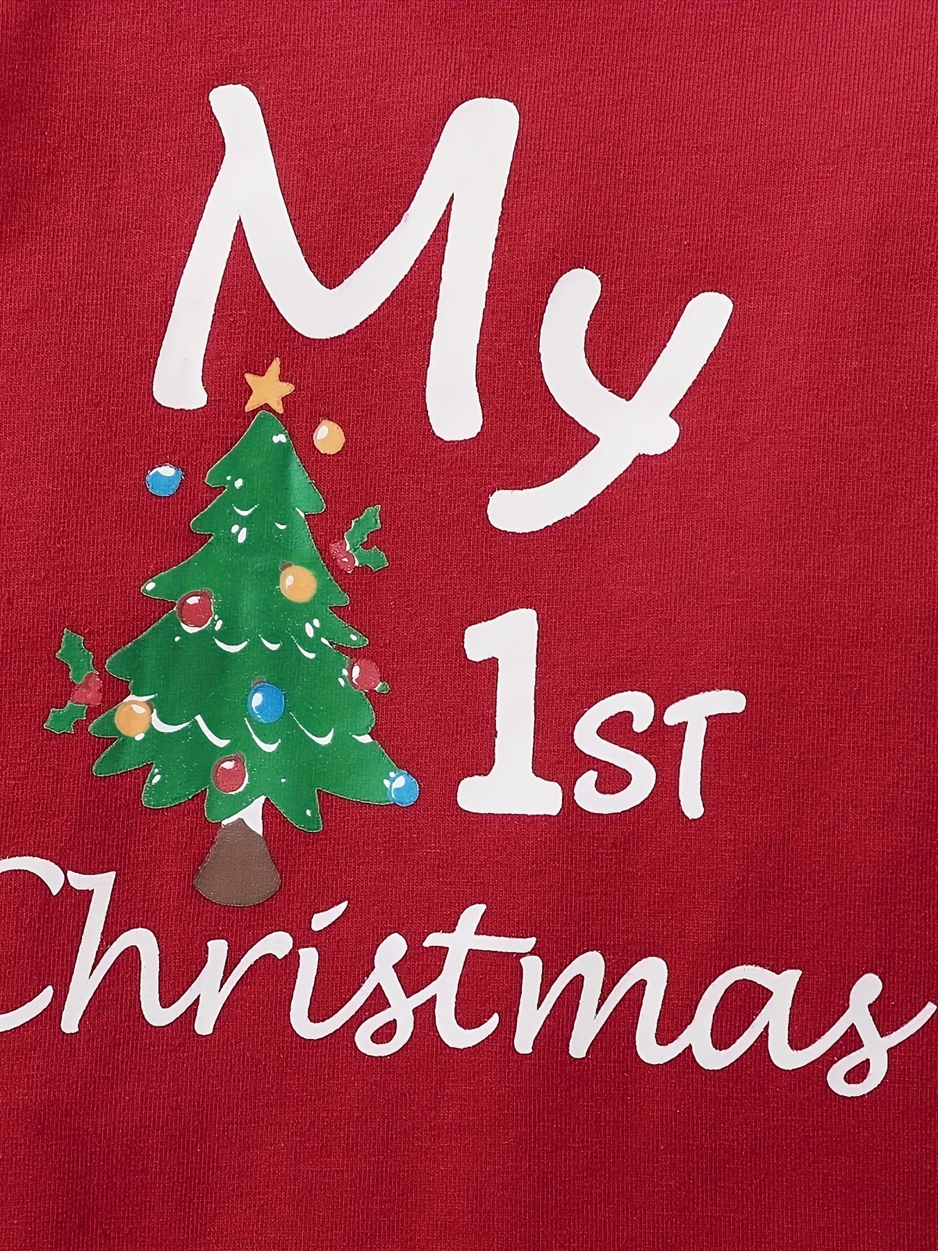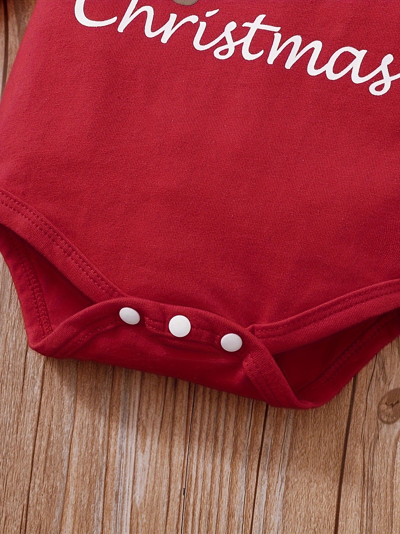 Baby Girl Christmas Set, Flying Long Sleeve Cute Cartoon Pattern & Letter Print Casual Triangle Romper + Pattern Print Pants + Headband Three-piece Set Plus Hat, Outdoor Cloth