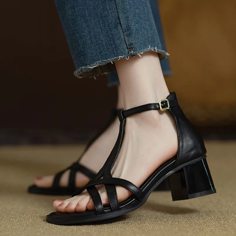 Sandals for women 2025 new summer hollow out versatile mid heel Roman high heels bag heel women's shoes
