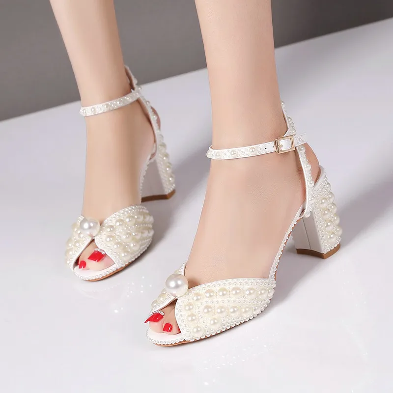 Sweet Handmade Pearl Stiletto Line With Shallow Cut Party Wedding Shoes Thick Heels High Heels For Women
