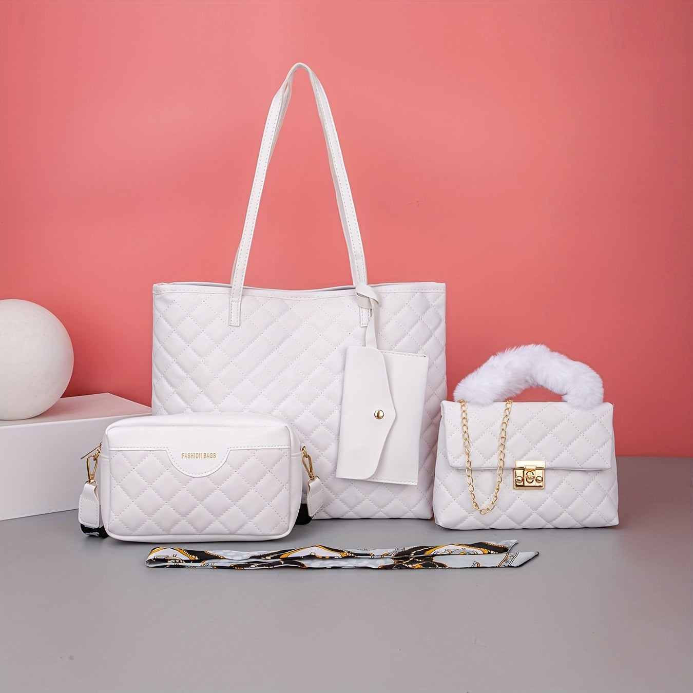 Quilted Detail Tote Bag Set: Classic Shoulder Chain Bag, Crossbody Purse with Scarf Decor