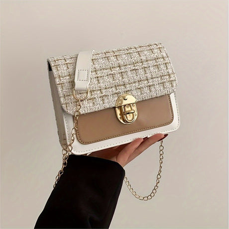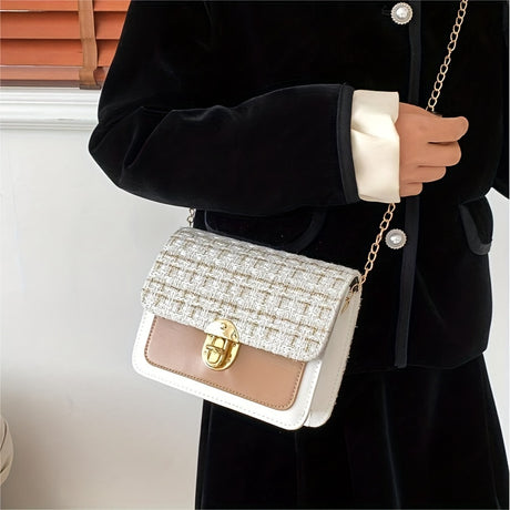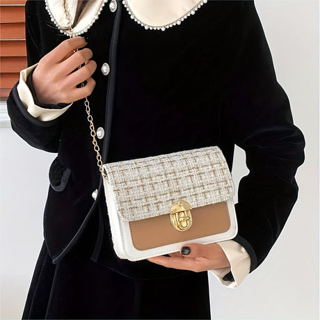 Fashion Tweed Chain Crossbody Bag, Mini Chain Square Purse, Trendy Turn Lock Shoulder Bag For Women