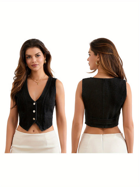 Women's Summer Jean Vest Tank Tops Sleeveless V Neck Button Down Denim Crop Tops Streetwear
