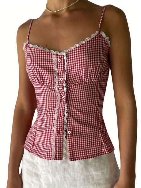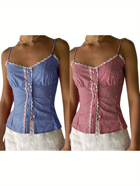 Women'S Lace Trim Camisole Fitted Plaid Sweetheart Neck Button Spaghetti Strap Crop Tops for Summer
