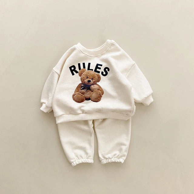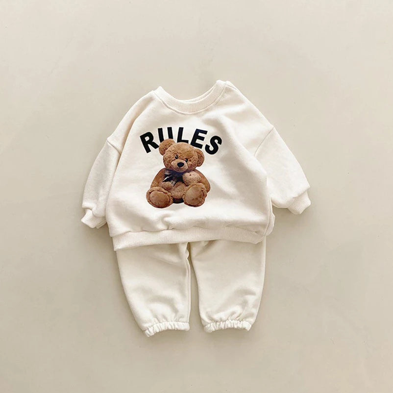 Korean 1-4Y Boys Outfit Set Toddler Girls Clothes Set Fashion Sweatshirt Tops +White Pants Spring Cartoon Bear Kids Clothes Suit