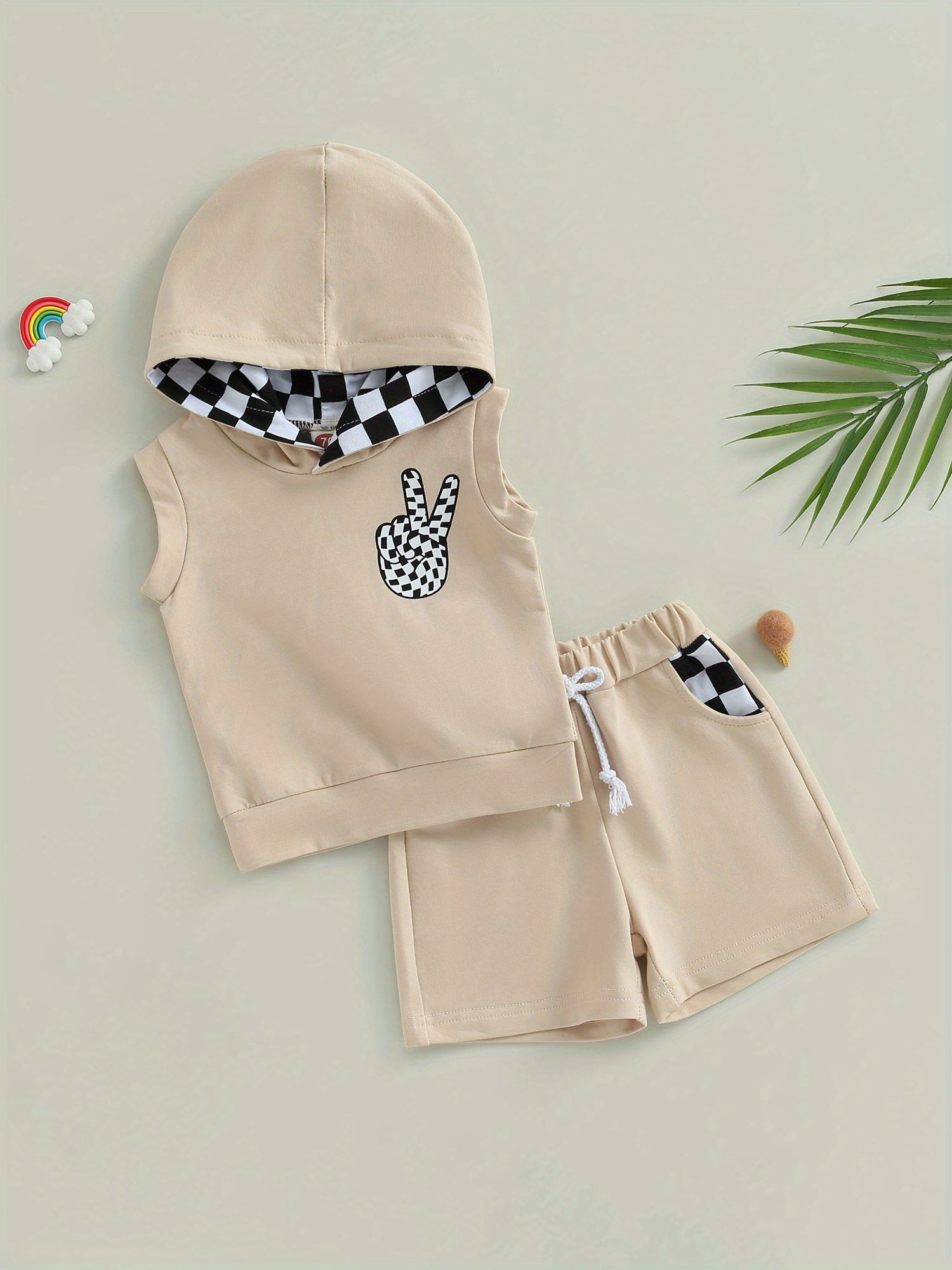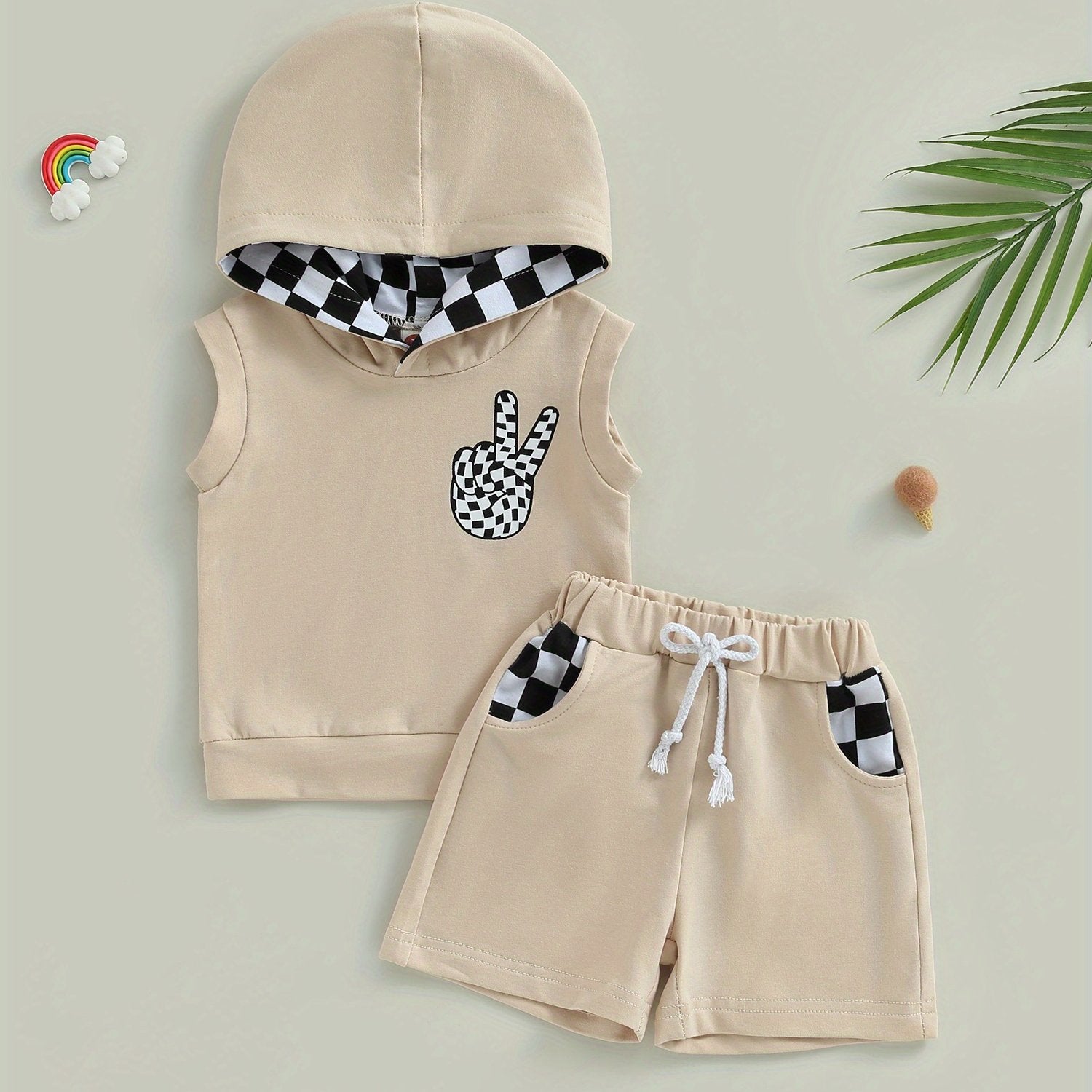 Toddler Boys 2pcs Shorts Sets Sleeveless Hooded Vest and Drawstring Checkerboard Shorts Sets, for Outdoor