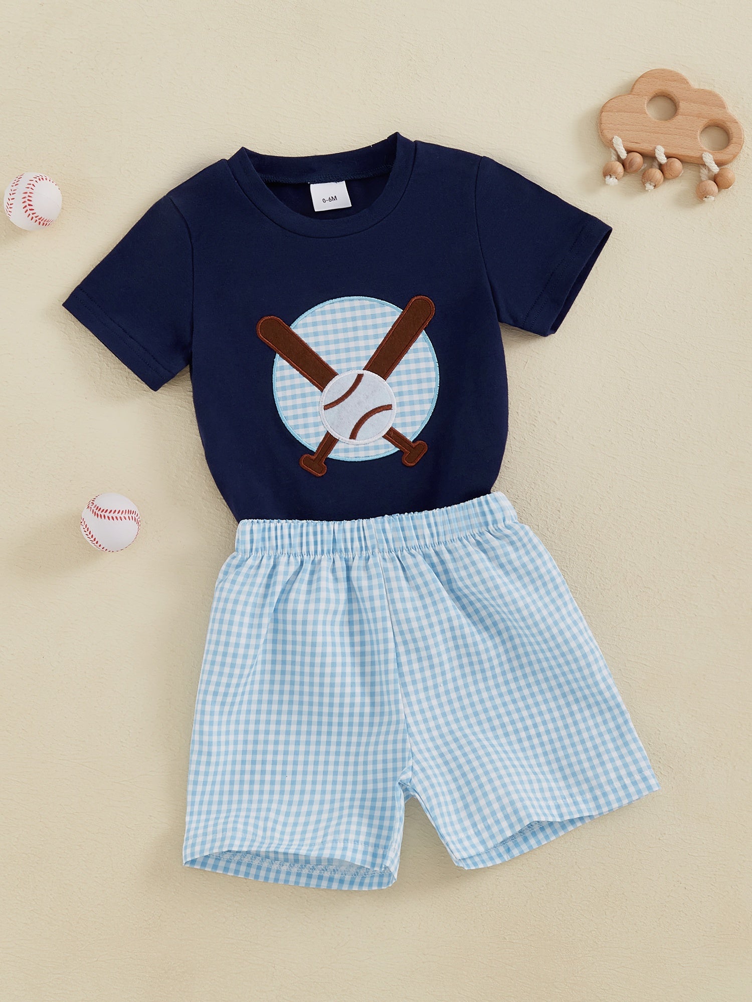 Toddler Boys' Baseball Embroidered Cotton Shorts Set - Comfy Short Sleeve Round Neck Top with Elastic Waistband Plaid Shorts, Machine Washable, All-Season Wear, Comfortable Playwear|Playful Kids' Clothes|Easycare Clothing, Pe - Blue / 0-3M is backordered and will ship as soon as it is back in stock.