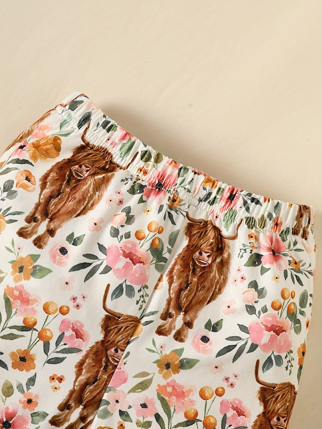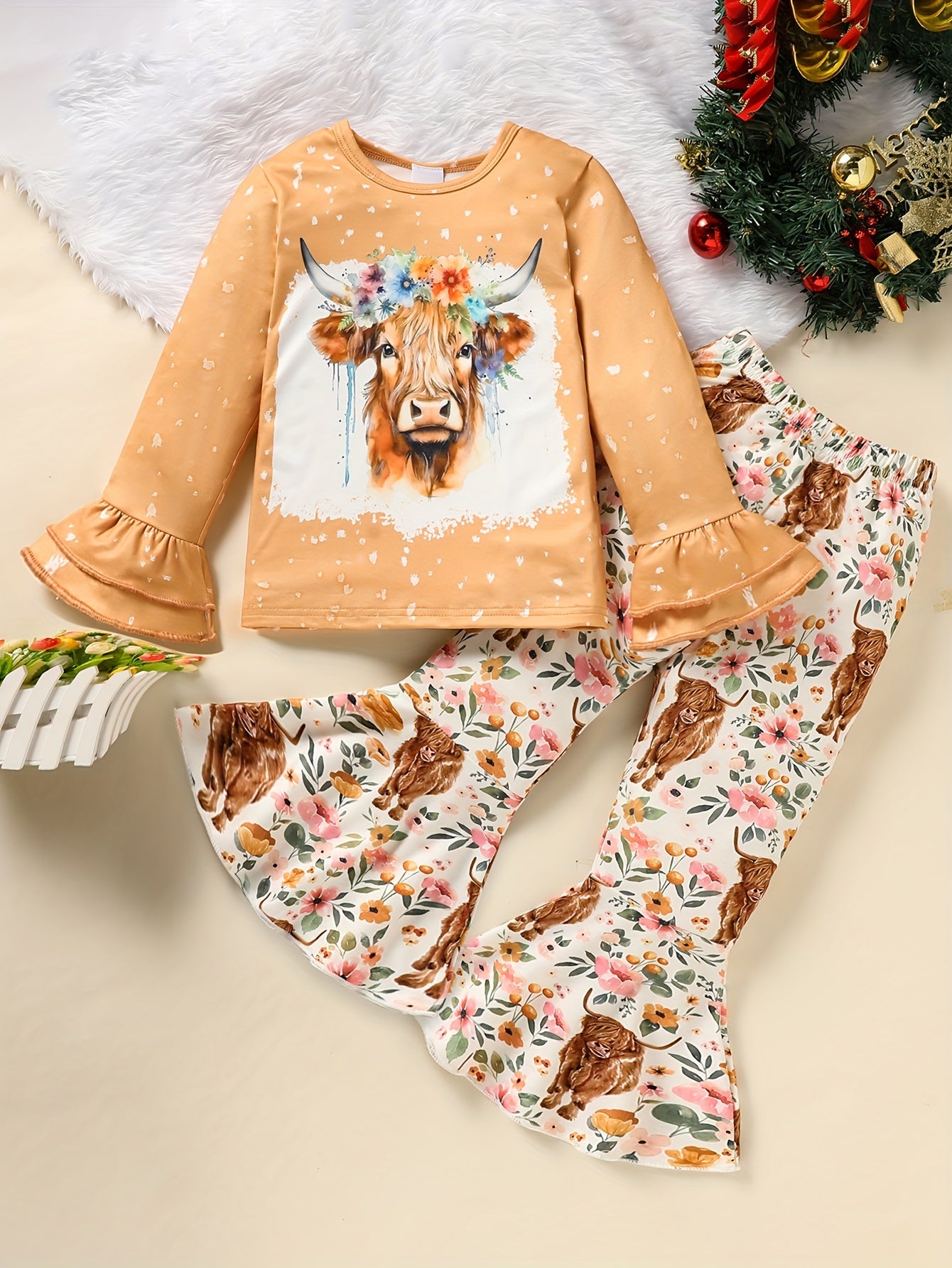 Zehjuhan Toddler Baby Girls Clothes Long Sleeve Round Collar Bull Head T Shirt Tops Print Flared Pants Casual Little Girls Outfit Set