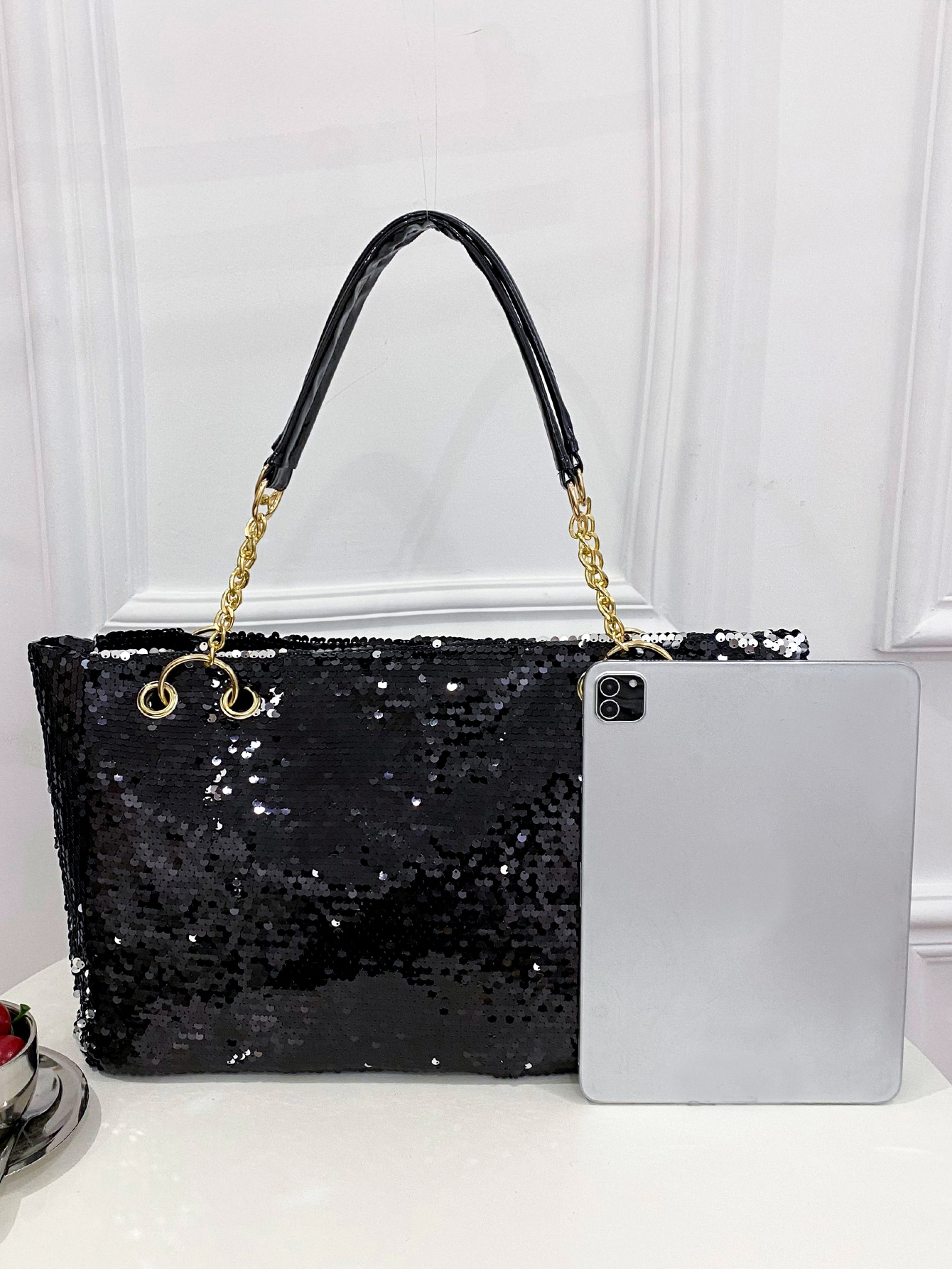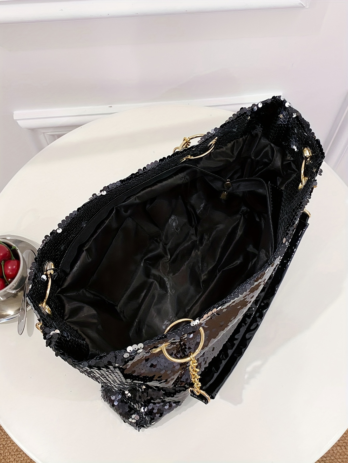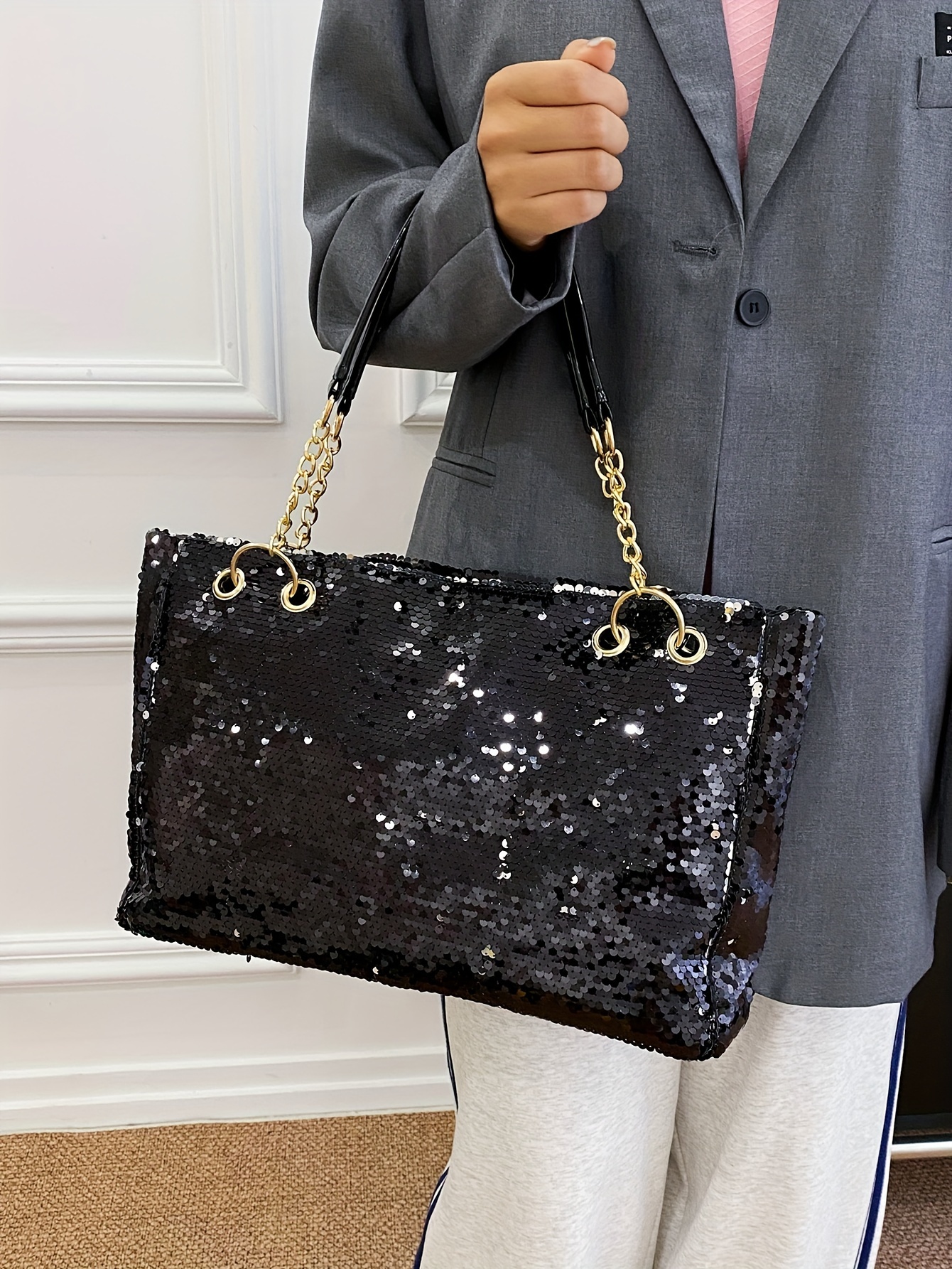 Large Capacity Sequin Glitter Tote Bag - Sparkly Bling Metal Chain Shoulder Bag with Fixed Straps, Polyester Lining, and Zipper Closure - Perfect Casual Commuter Bag for Carnaval and Everyday Use, Great Gift Idea