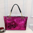 Large Capacity Sequin Glitter Tote Bag - Sparkly Bling Metal Chain Shoulder Bag with Fixed Straps, Polyester Lining, and Zipper Closure - Perfect Casual Commuter Bag for Carnaval and Everyday Use, Great Gift Idea - Rose Red is backordered and will ship as soon as it is back in stock.