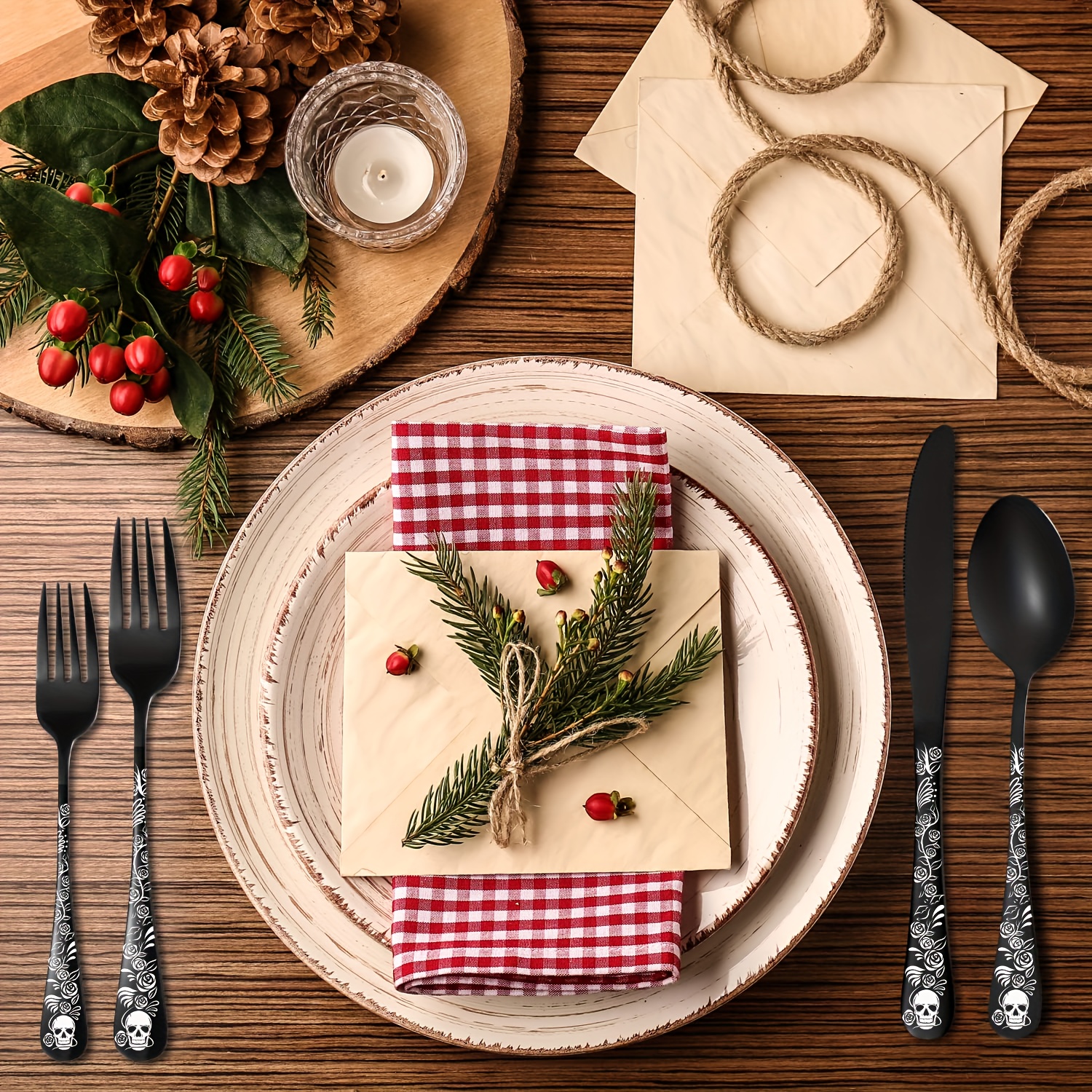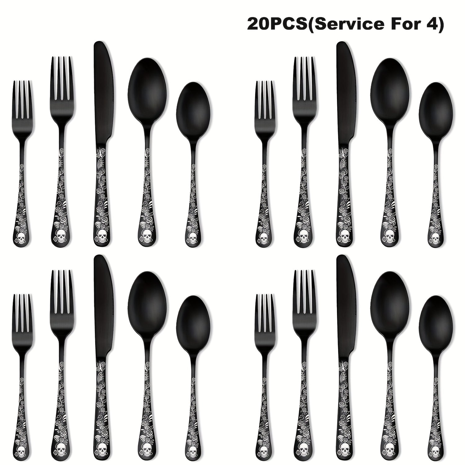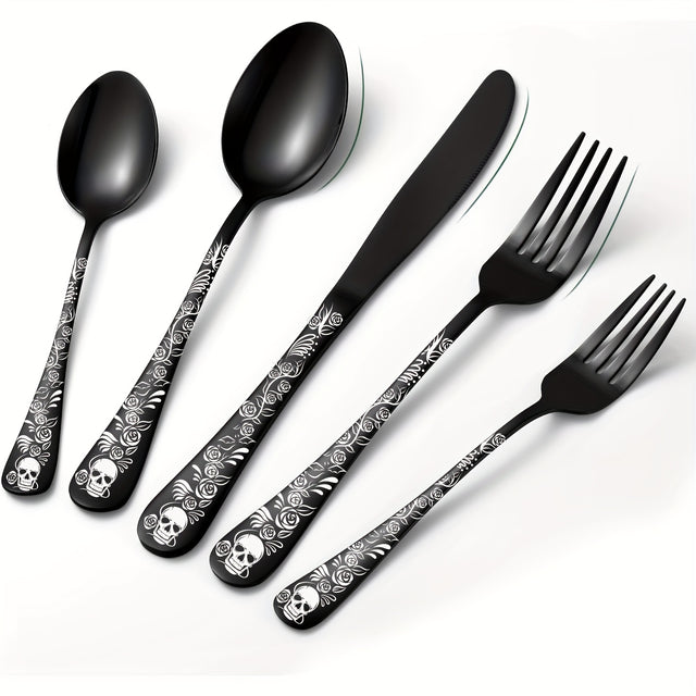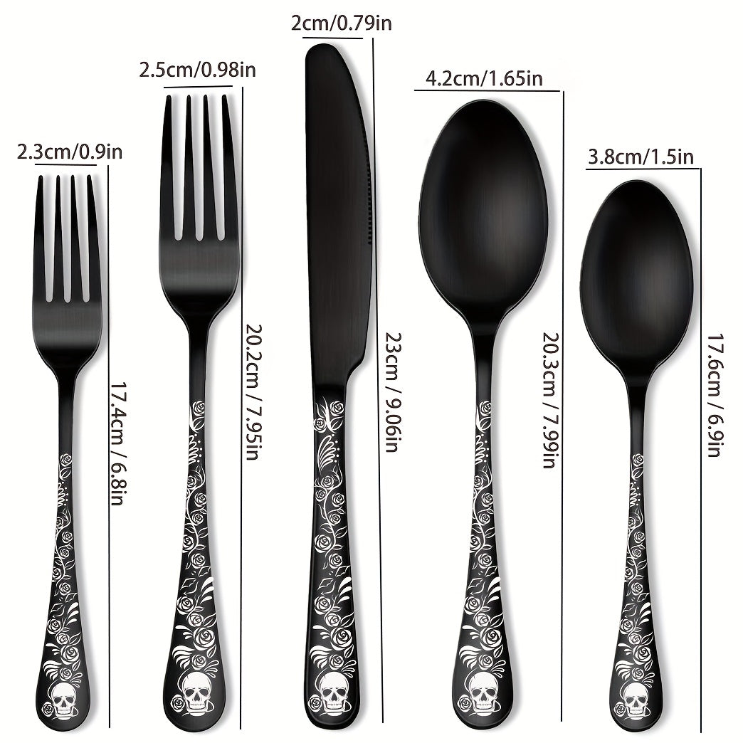 20/30pcs Gothic Design Cutlery Service For 4/6, Premium Stainless Steel Flatware Includes Spoon Fork And Knife, Cool Silverware With Skull&Rose Pattern, Mirror Polished, Nice Gift For Dark&Rock Lover/Halloween/Day Of The Dead