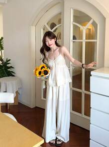 DAZY Women Solid Color Casual Camisole & Lace Patchwork 2 Pieces Set