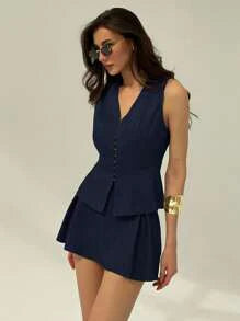 easyown 2 Pieces Set for Women Casual Solid Color V-Neck Sleeveless Top And Shorts