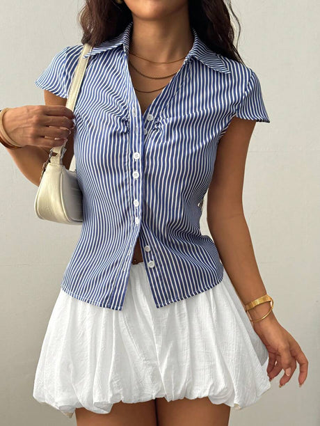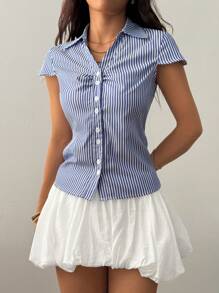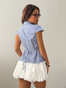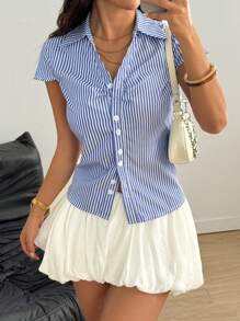Flirla Casual Style Cinched Waist Front Open Hooded Short Sleeve Shirt