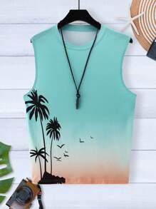 Men Casual Round Neck Sleeveless Vacation Style Tank Top, Teal Tropical Graphic Beach Top
