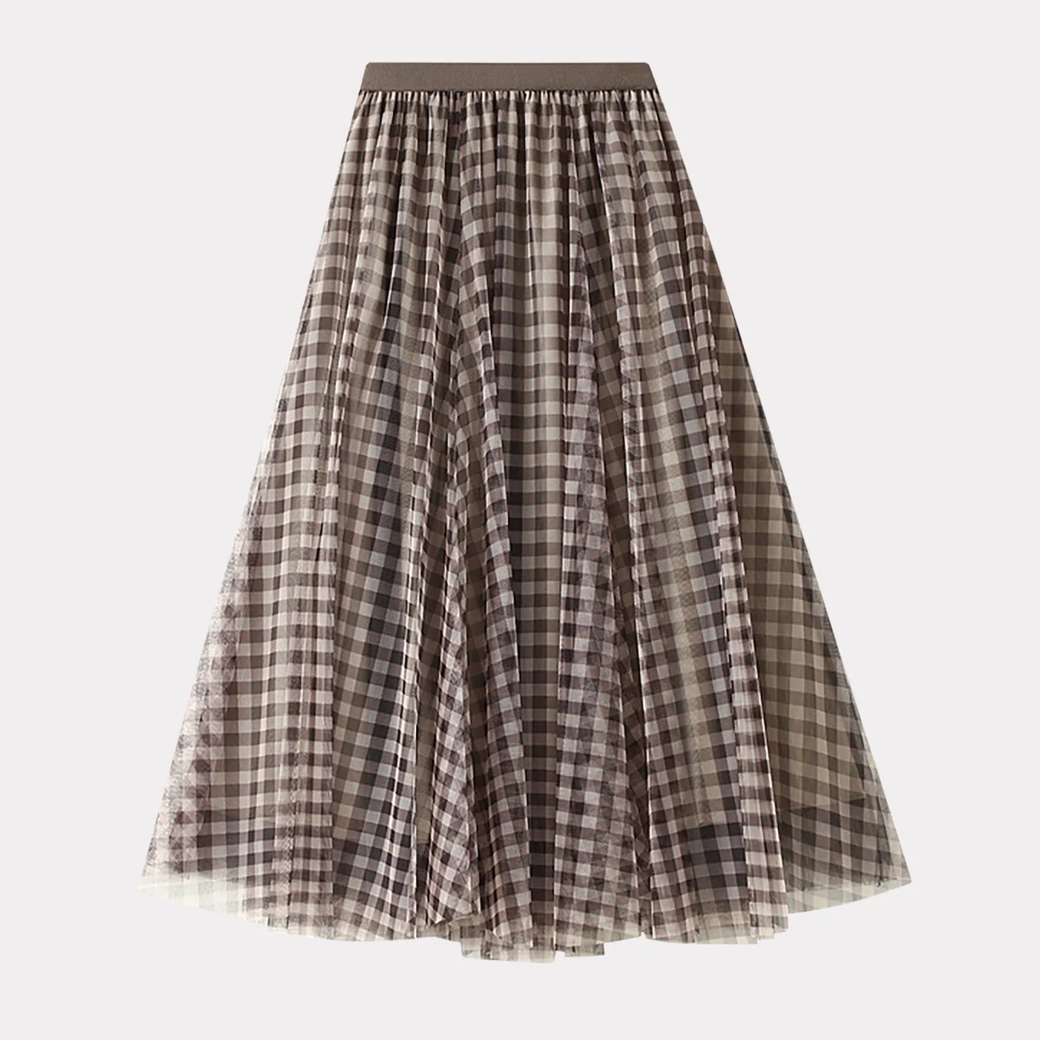 Skirts For Women Women's Plaid Print A Line Elastic Waist Multi Layered Tulle Mesh Skirts For Women Large Swing Dark Bottoms - Khaki / One Size / CN is backordered and will ship as soon as it is back in stock.