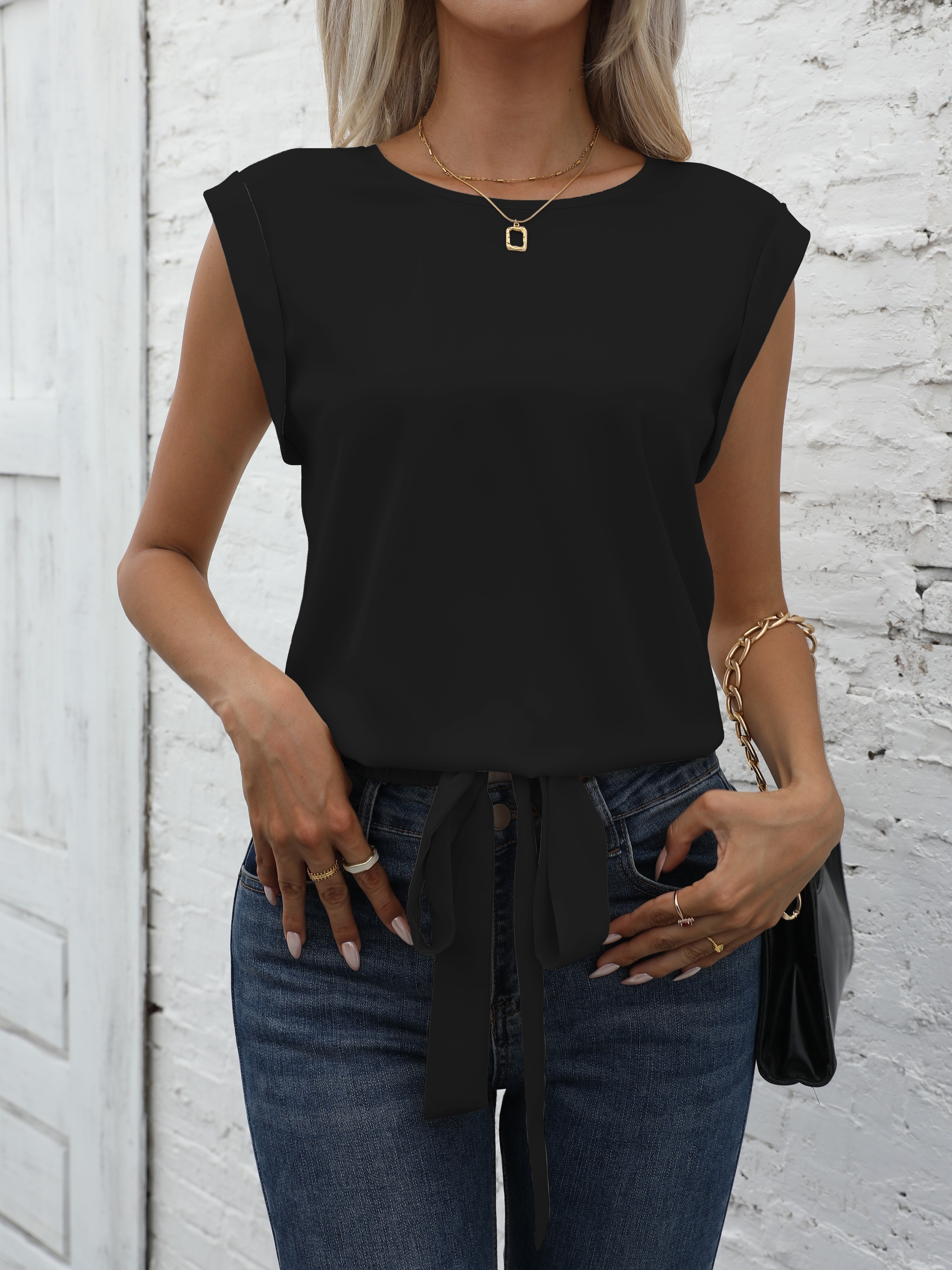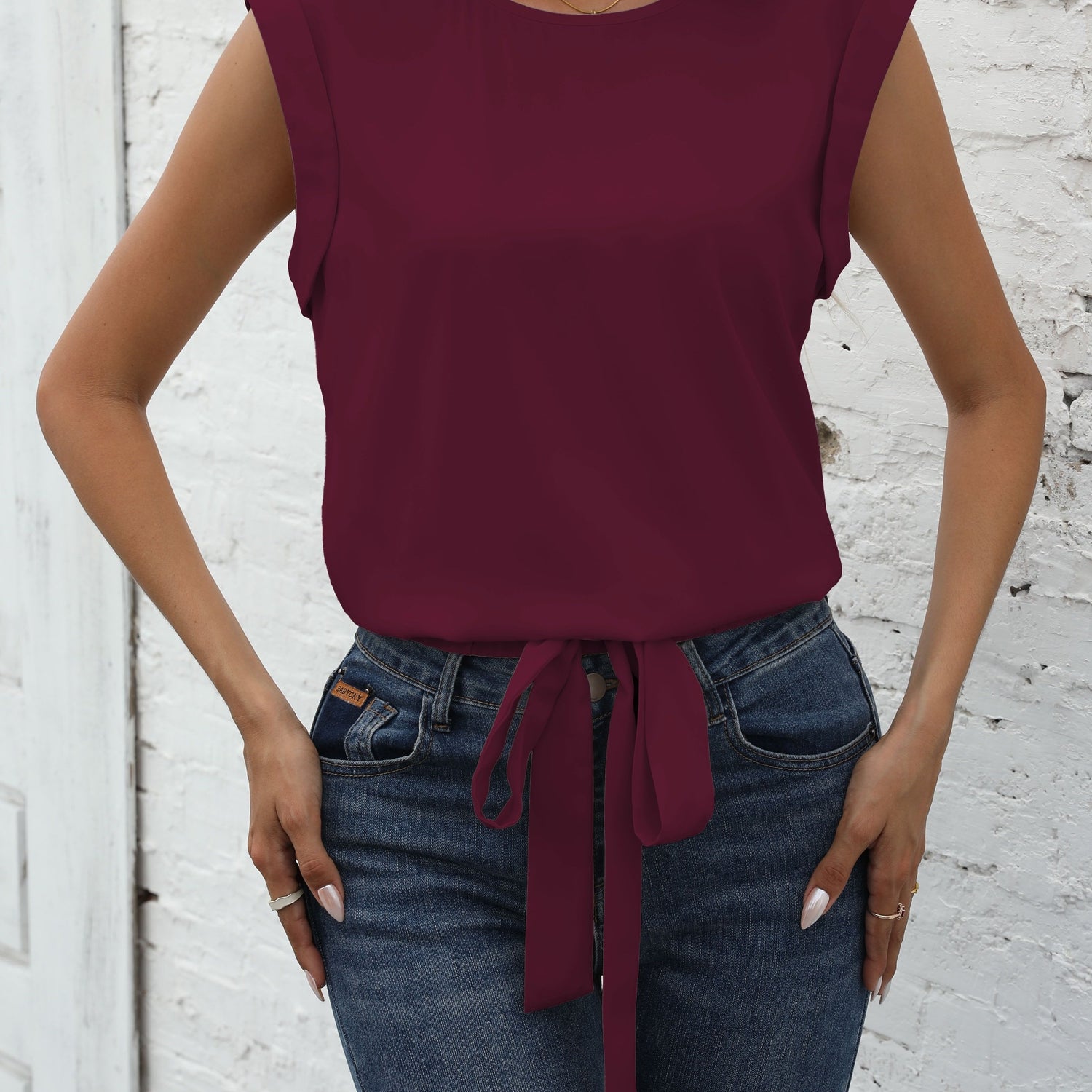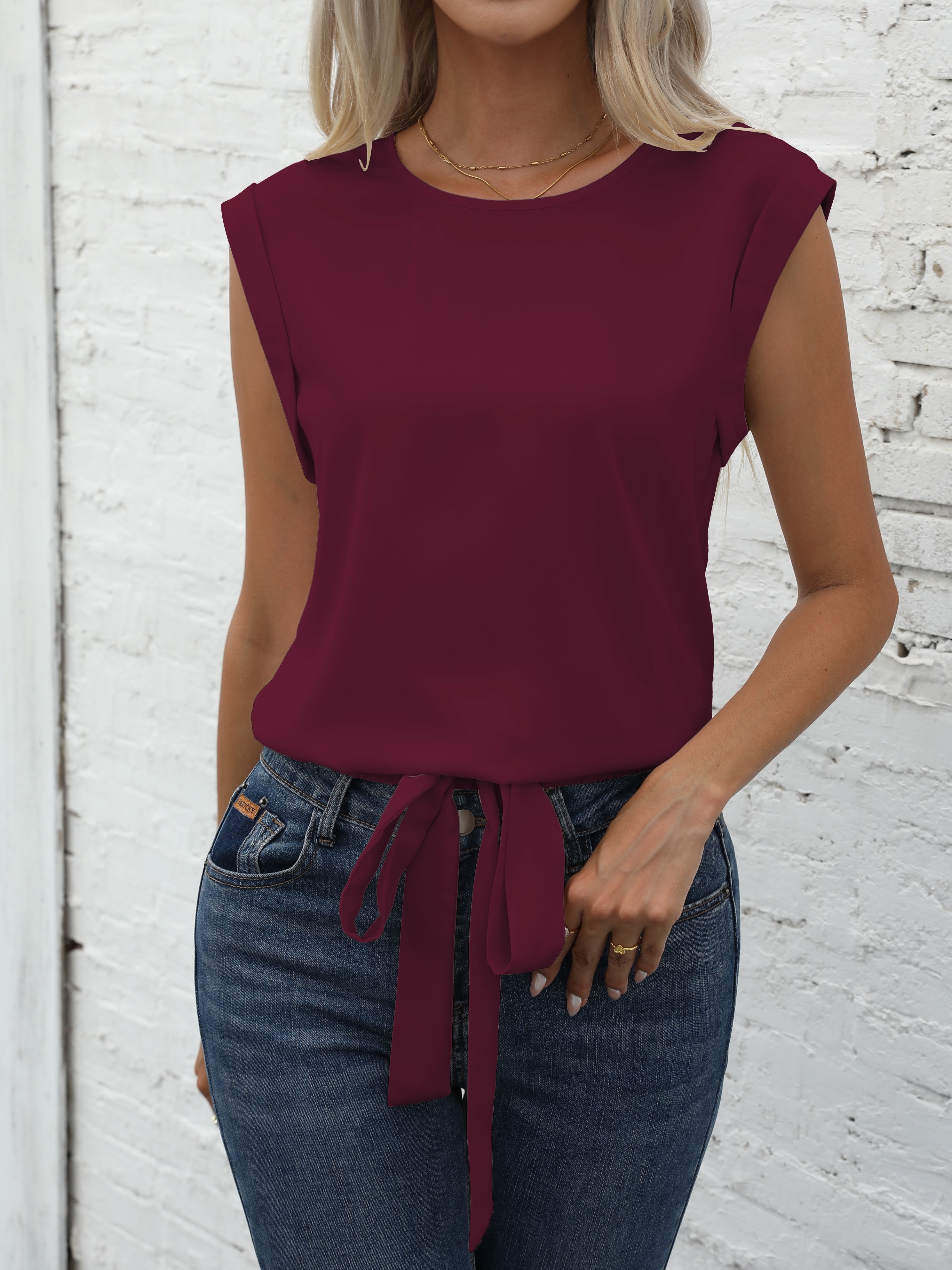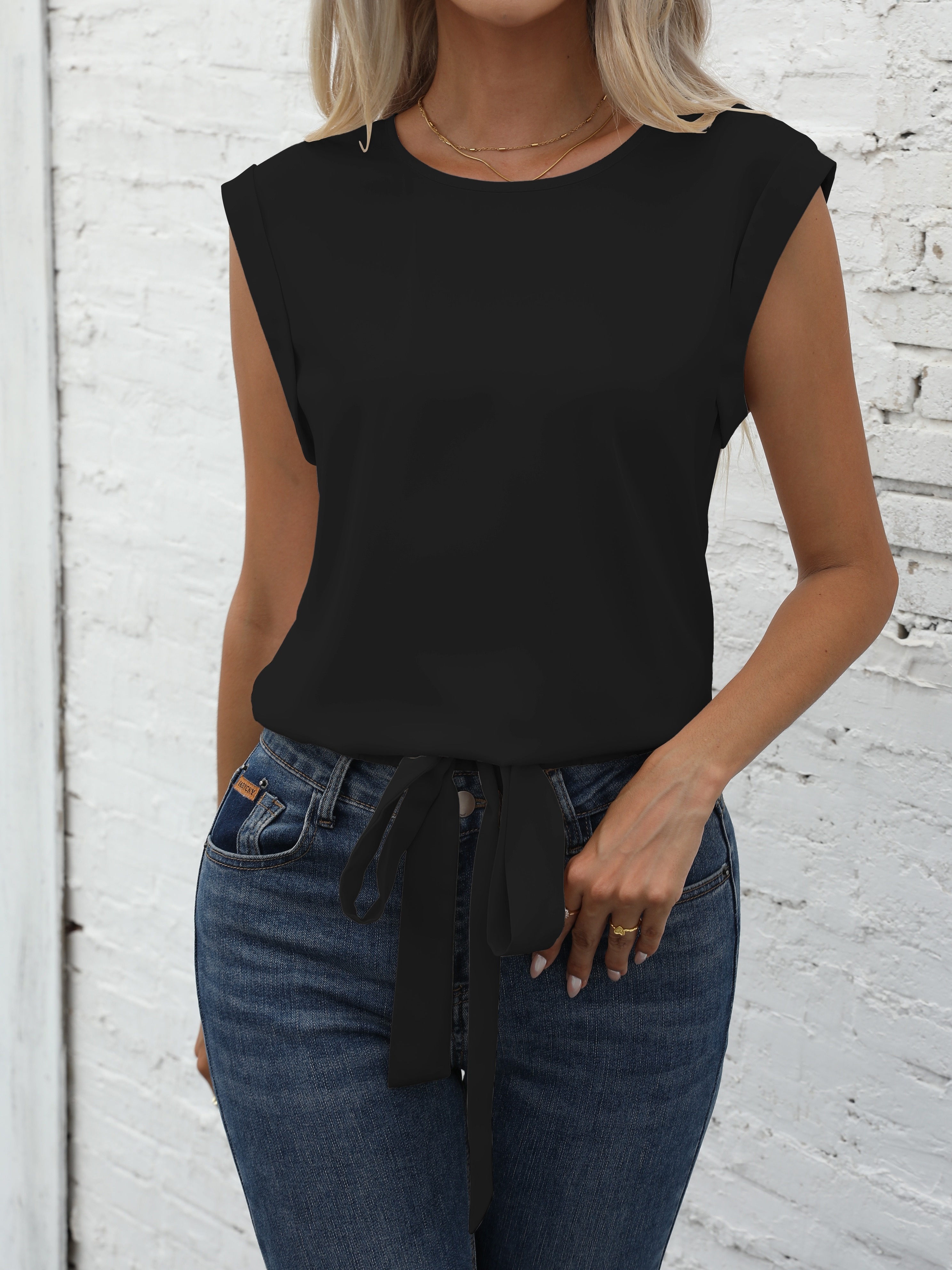 Chic Keyhole Back Tie Front Blouse - Effortless Casual Style with Classic Crew Neck Design - Perfect for Womens Spring and Summer Fashion